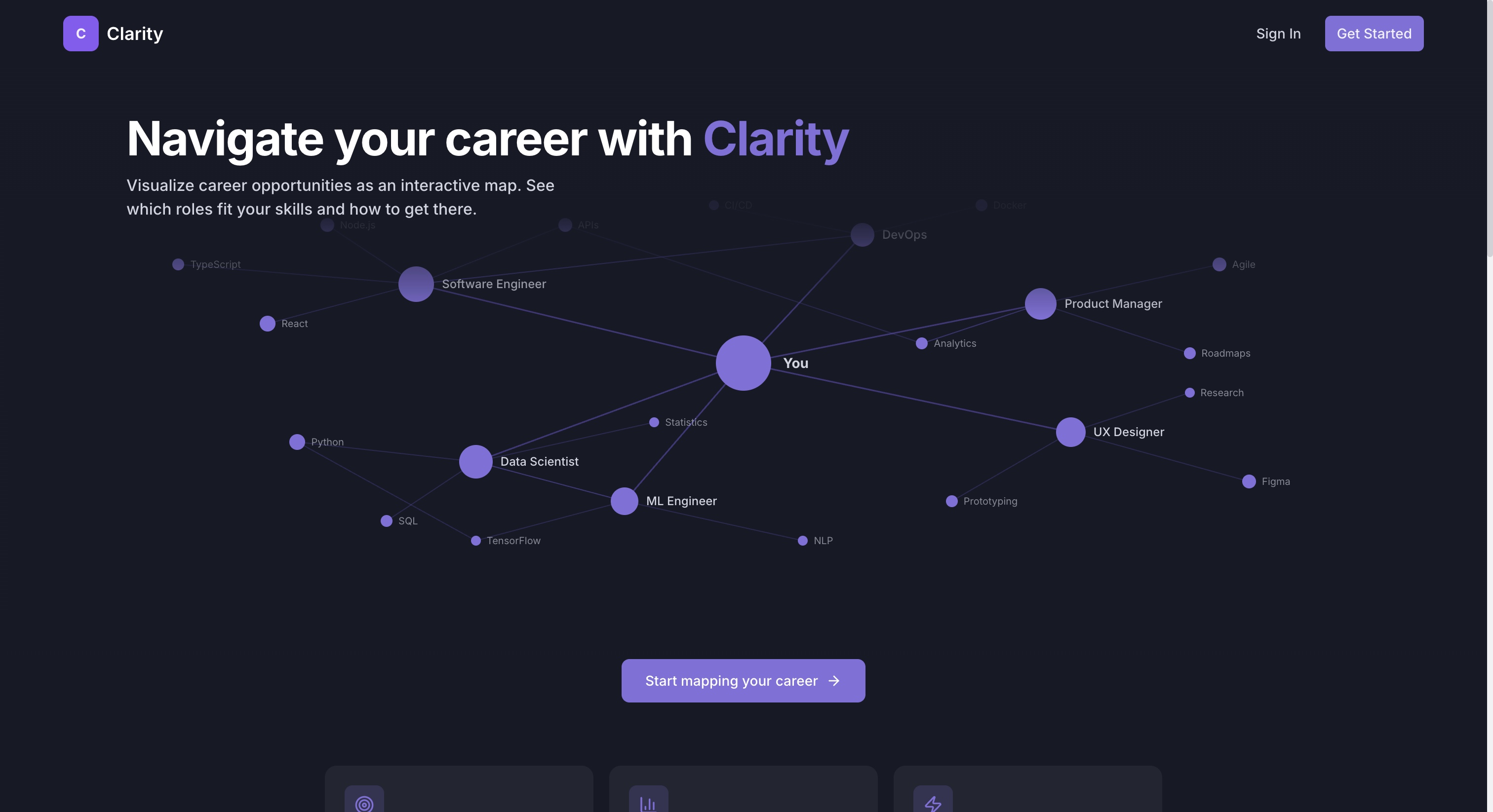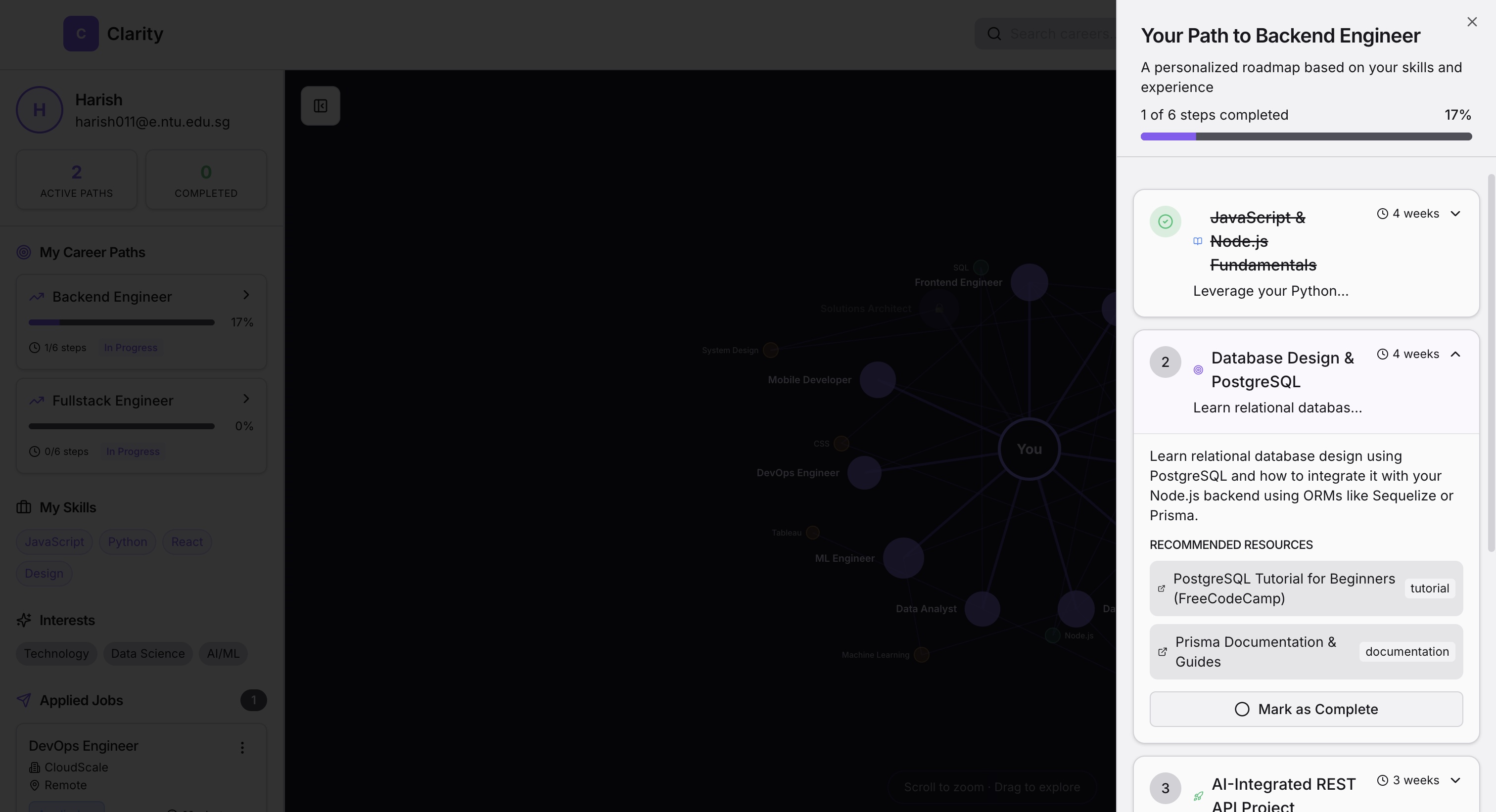 Beyond matching, Clarity generates AI-driven personalized career roadmaps that show users what skills to learn, experiences to gain, and steps to take to reach their target roles — helping users not only find jobs, but progress toward the careers they want.