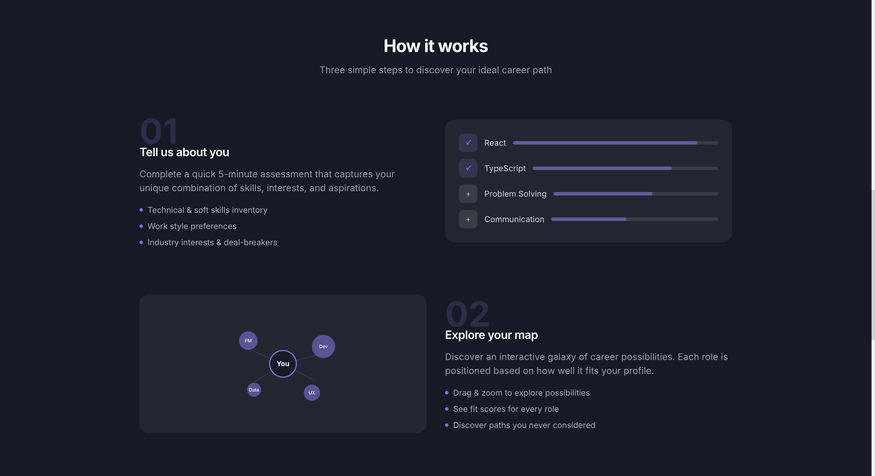 • Turned career discovery into a guided, intelligent experience rather than a static search page.