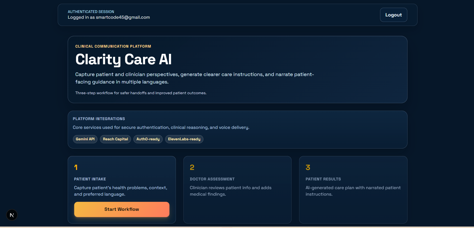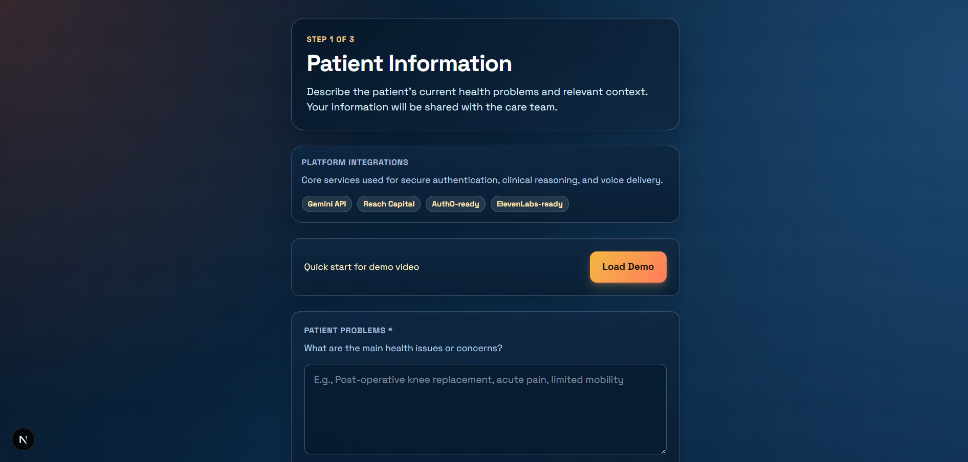Frontend: Next.js + React + TypeScript Auth: Auth0 for secure clinician access AI Generation: Gemini for structured care-plan synthesis Multimodal Extraction: Gemini for image/PDF clinical-note extraction Voice Output: ElevenLabs for patient-friendly narration Workflow State: in-memory session handling across multi-step routes Demo Readiness: preloaded scenario cases and one-click quick demos