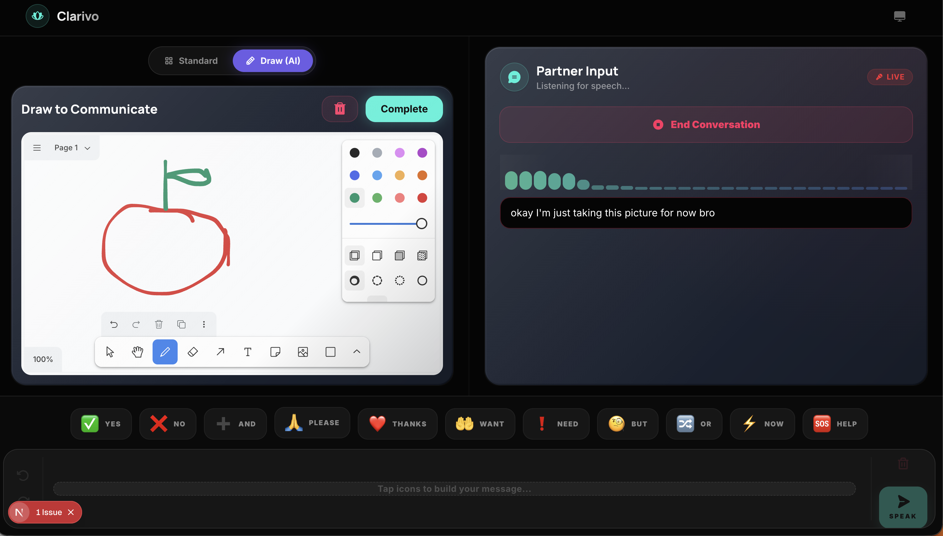 Clarivo is an AI-powered AAC platform that helps non-speaking or speech-impaired users communicate through icons and structured intent building.