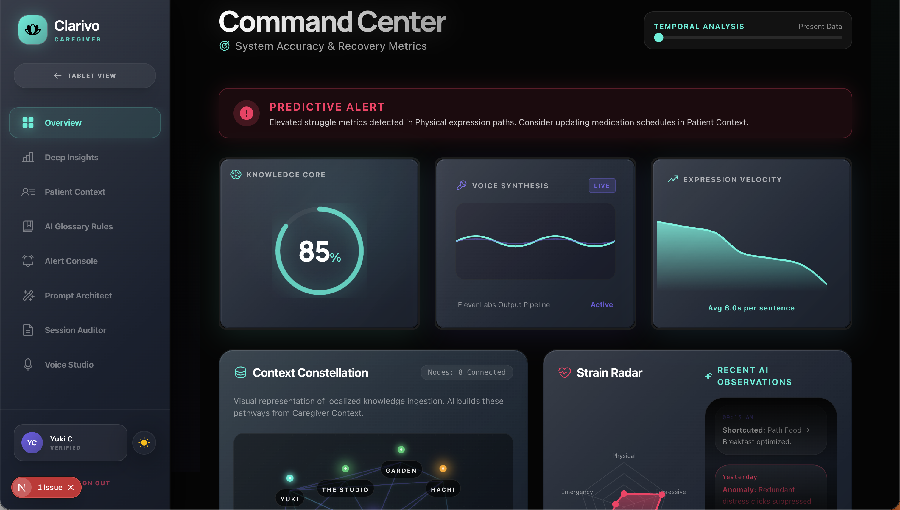 1 in 3 stroke survivors develops aphasia, losing reliable speech despite full cognitive ability. Existing AAC tools are either expensive ($15,000+ hardware) or clinically inaccessible. We built Clarivo to close that gap with a free, intelligent system that restores communication—not just through speech synthesis, but through personalized, adaptive expression that evolves with the user.