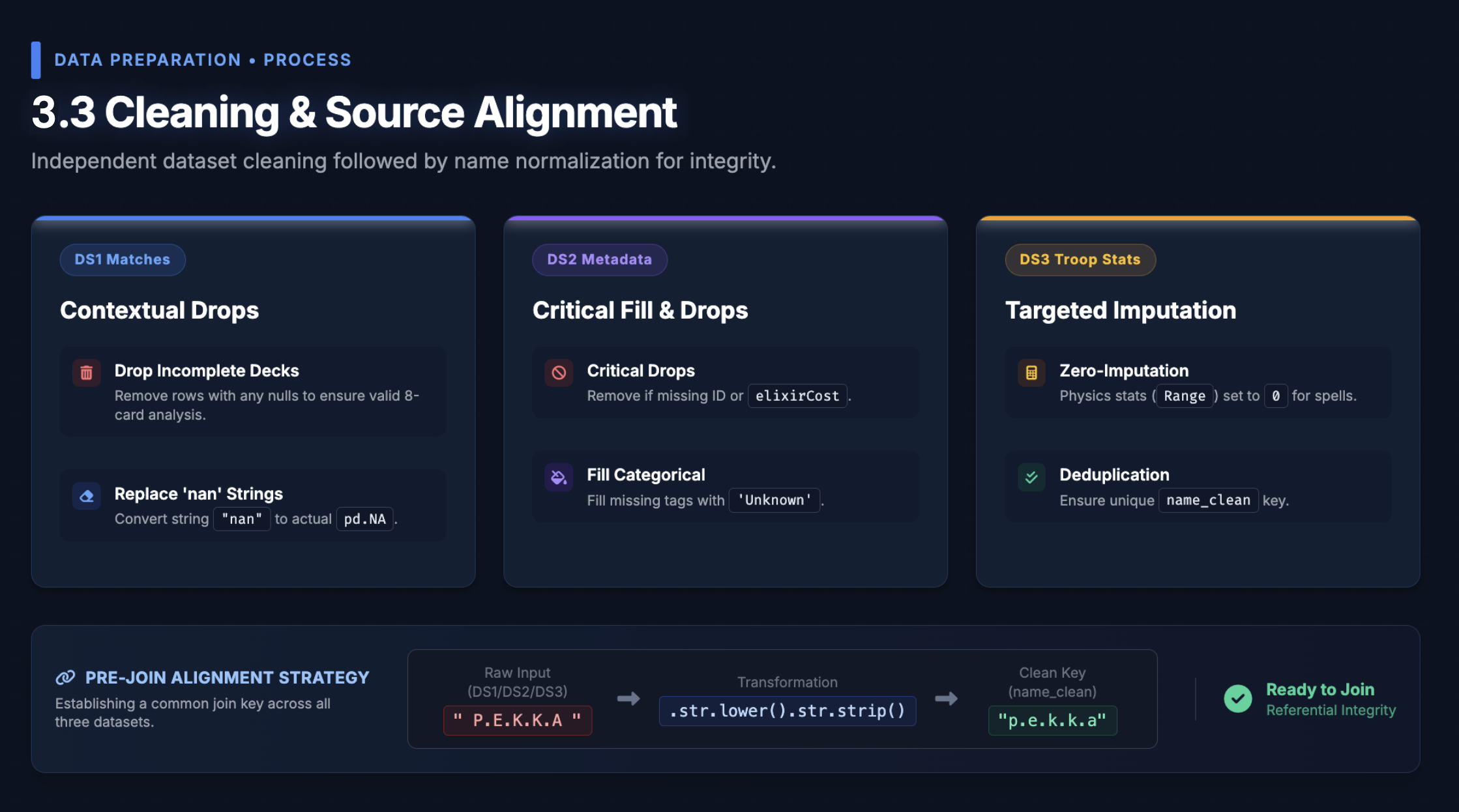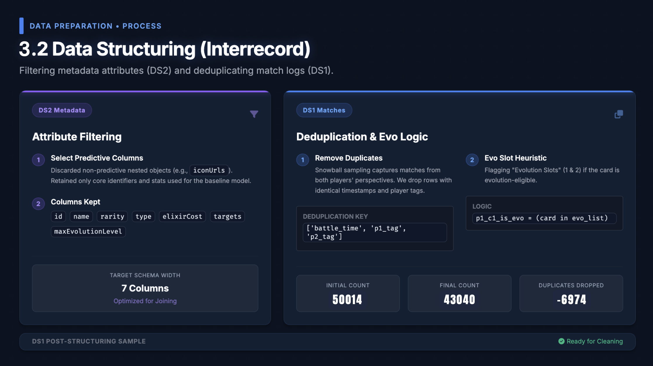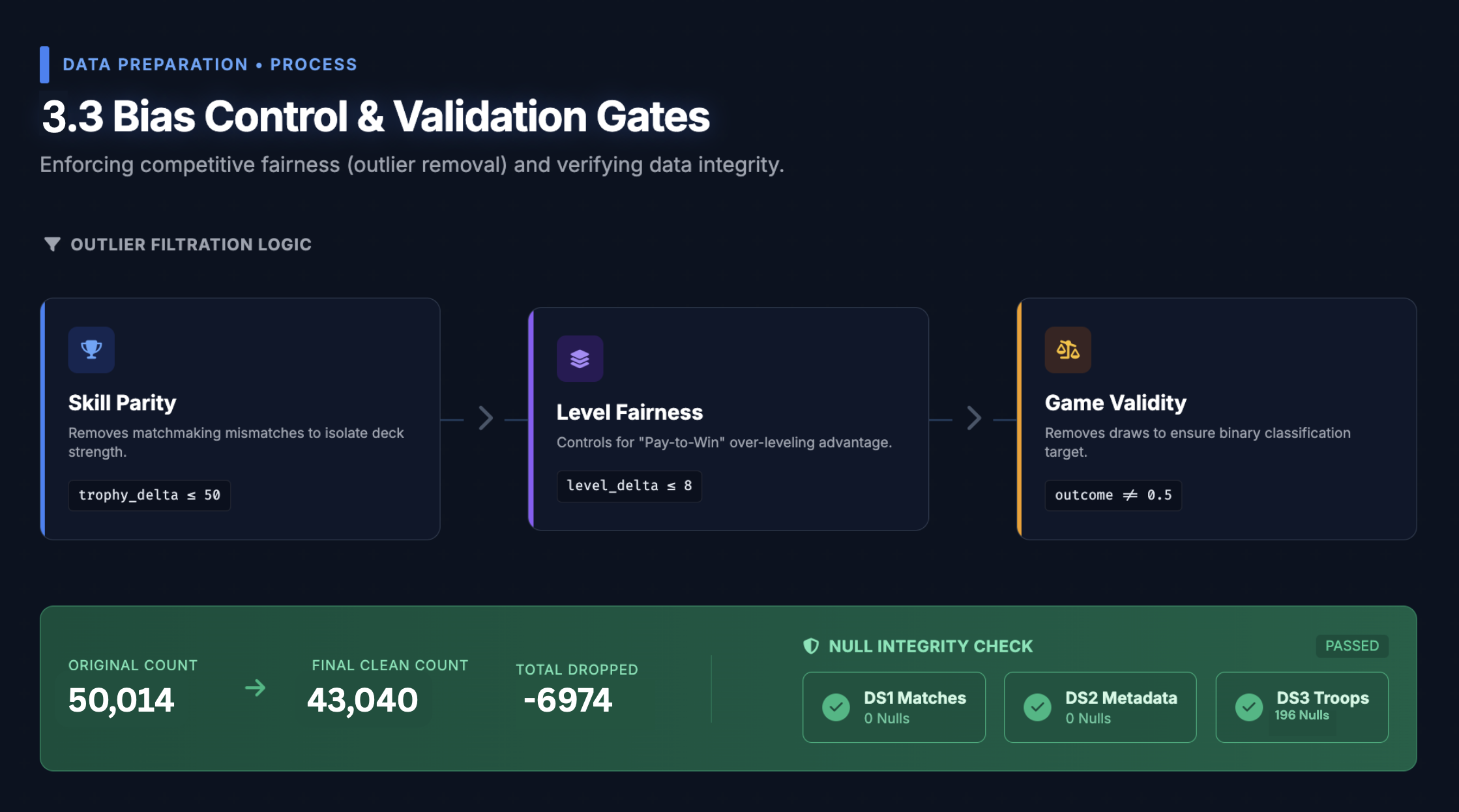 A key insight from the start: raw battle data is noisy with non-deck factors. We applied two hard filters before modelling:
