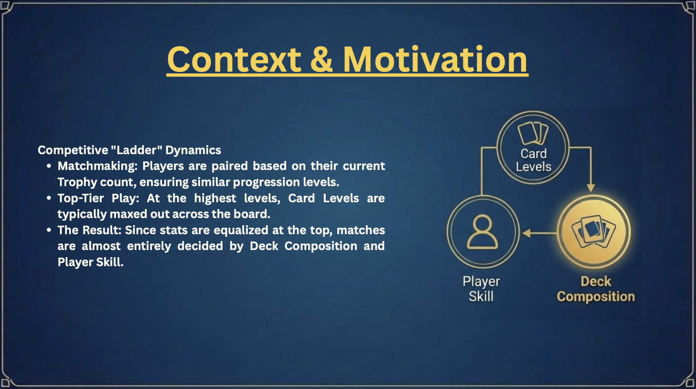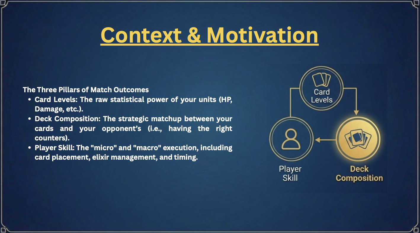 This is harder to answer than it sounds. A player might win not because their deck is better, but because they're more experienced, or because their cards are higher level. We wanted to isolate the strategic signal of deck composition itself, stripped of those confounders. That challenge — equal parts data engineering and machine learning — is what drew us in.