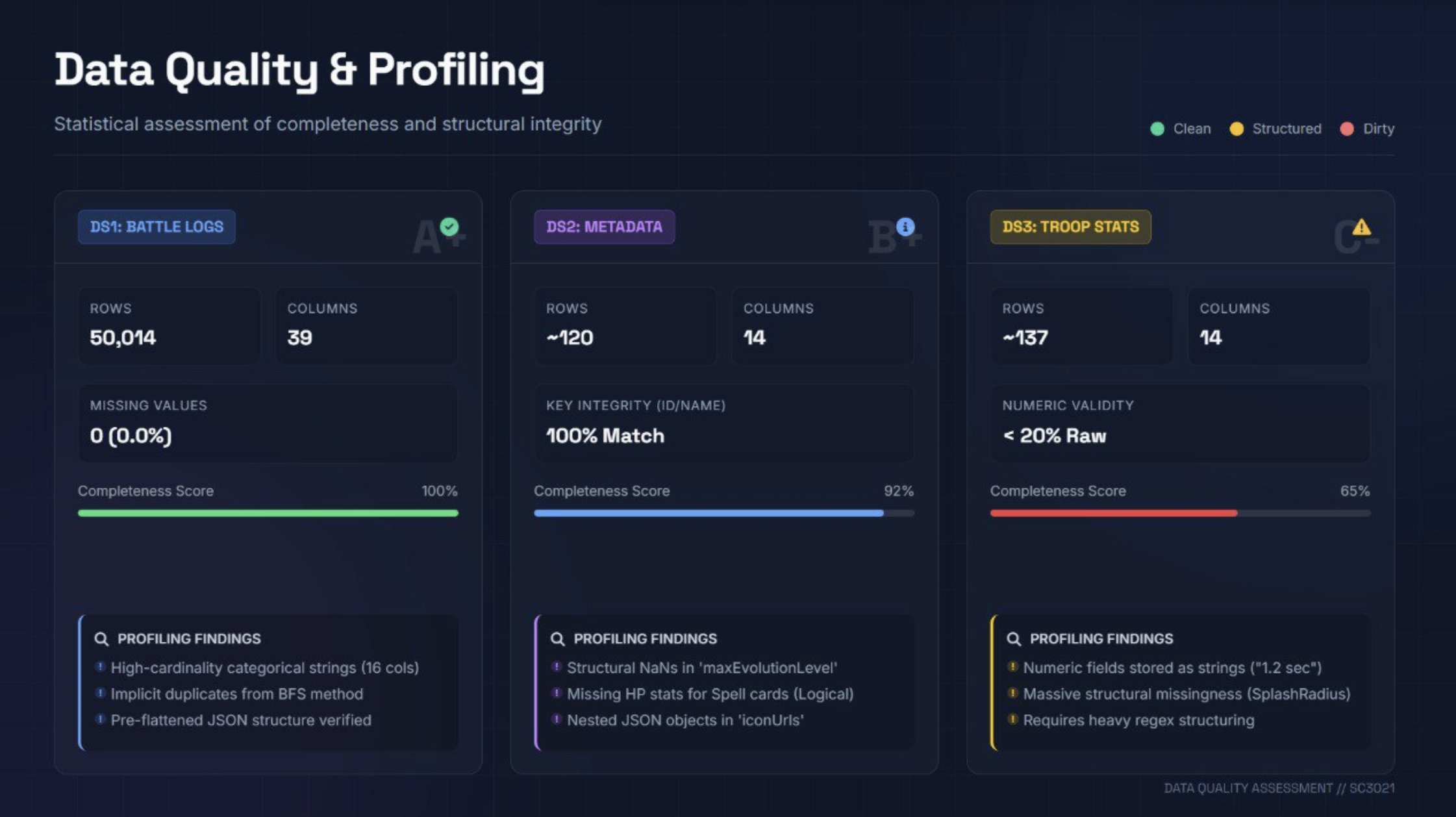 The crawler also included a rarity-aware level normalisation step. Because the API reports raw internal levels that differ by card rarity (a Level 1 Legendary ≠ a Level 1 Common), we mapped every card to its in-game "standard level" on extraction to ensure fair numerical comparisons downstream.