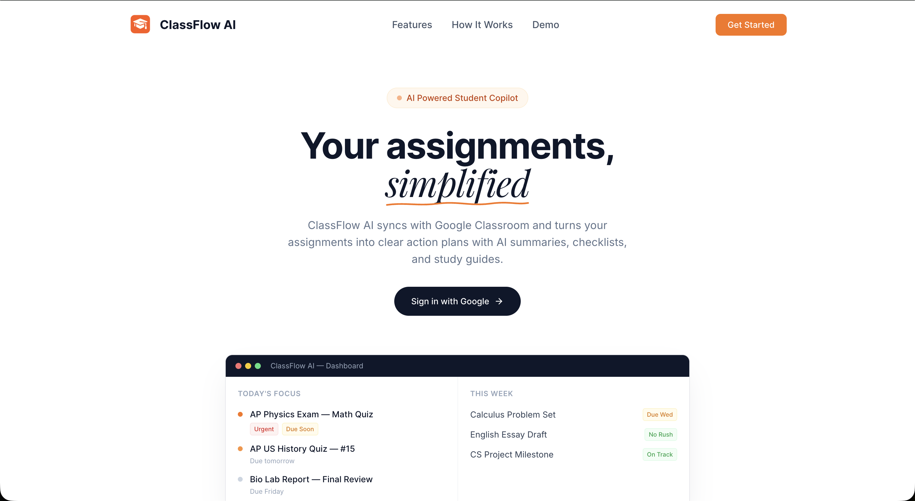 What it does ClassFlow syncs courses and assignments, surfaces deadlines and context in a single dashboard, and layers AI on top of your actual work: readable summaries, study breakdowns, mini lesson cards, practice mode with a floating tutor, Kahoot-style quiz generation, grades tracking, and flows that tie back to Google (e.g. opening work where it already lives). It’s built to reduce tab-hopping and decision fatigue.