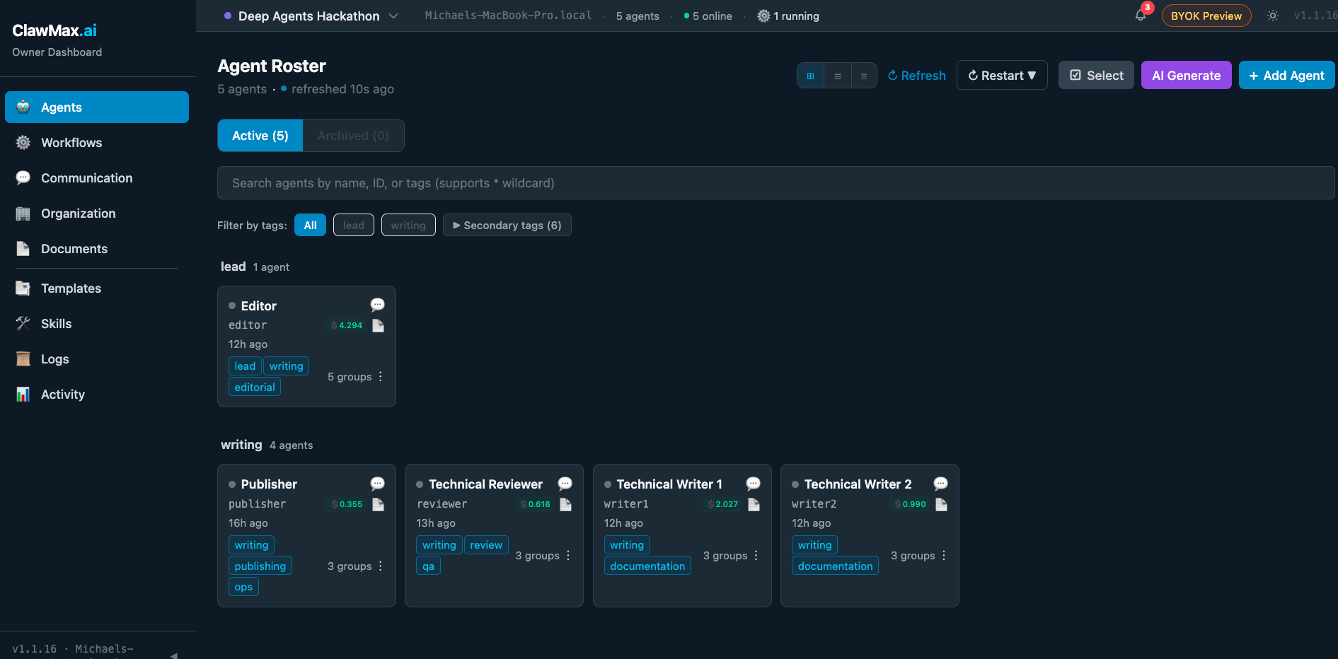 We built ClawMax because most agents can reason, but very few can operate as real teams. The hackathon prompt pushed exactly on that gap: agents should observe live inputs, share context, coordinate through workflows, and take action without requiring a human to manually stitch everything together. We were especially inspired by the idea of combining multimodal evidence with a shared memory layer, so agents could continuously learn from what they ingest and what they produce.