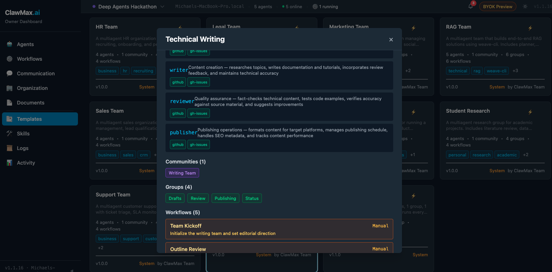 We are proud that we turned ClawMax into a real multimodal team orchestration story rather than a single-agent demo. Agents can now be created from an org template, automatically receive Senso- backed skills, ingest evidence into shared context, and coordinate through workflows with dependency structure. We are also proud of the improvements to the Skills experience, the template apply flow, and the Senso-specific skill adapters, because those make the system more reusable beyond just this hackathon.