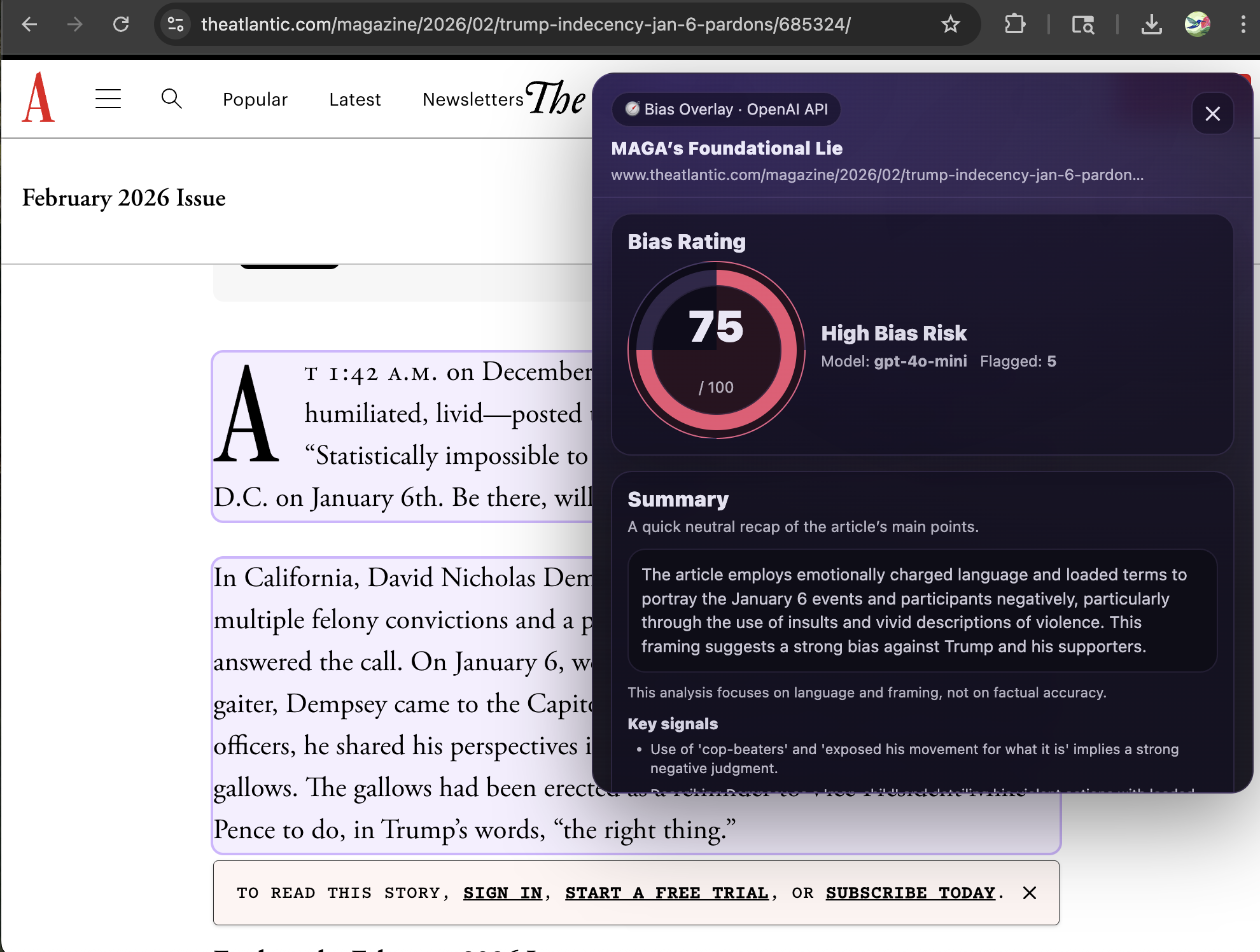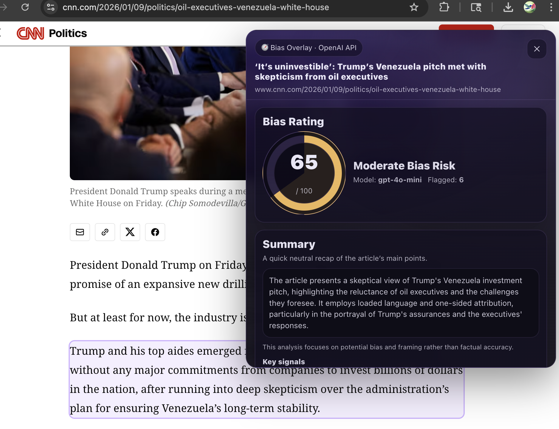 Our Chrome extension analyzes news articles for bias, emotional language, misinformation risk, and source credibility to produce a clear bias score.