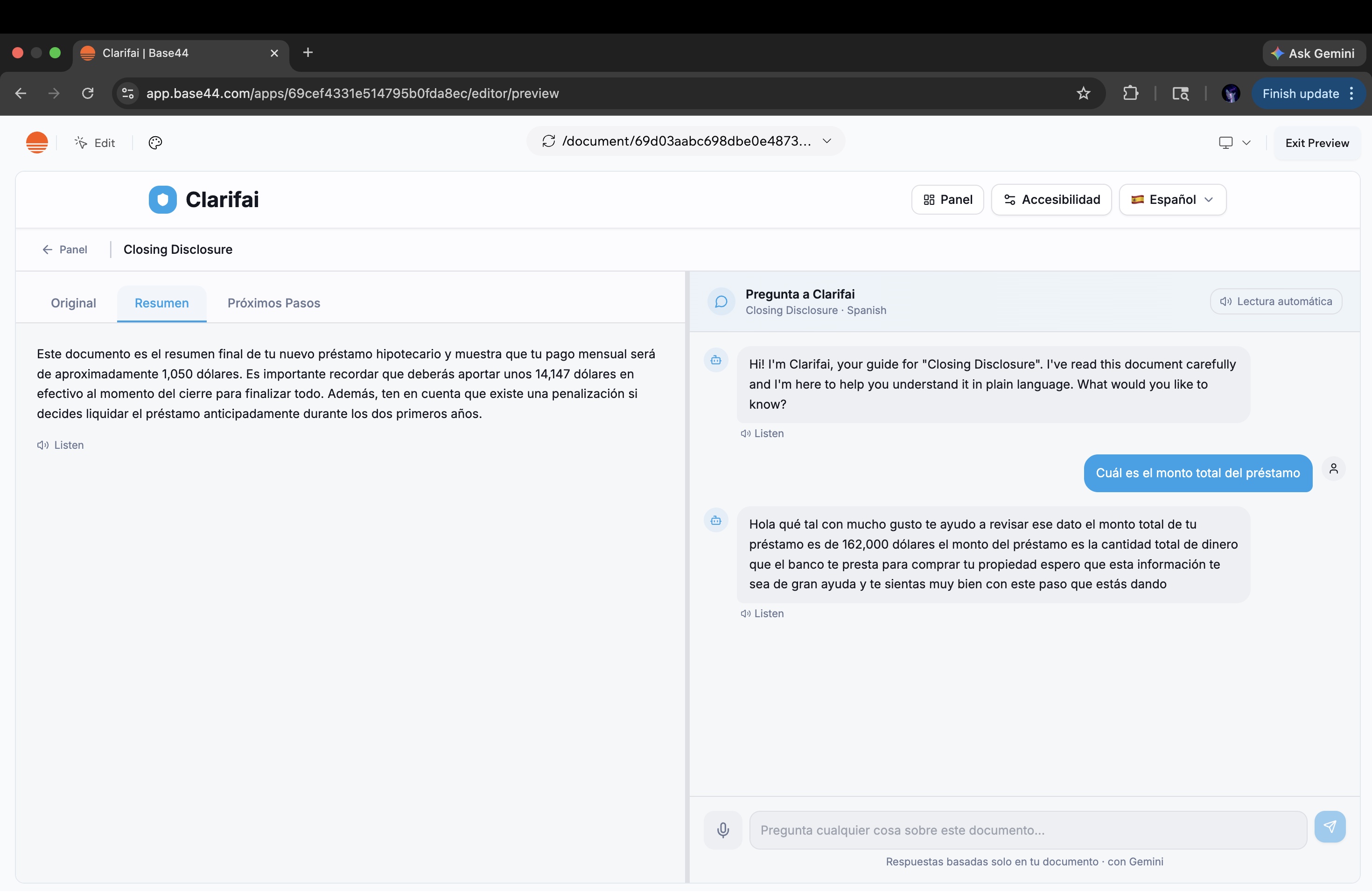 Seeing the AI take a dense, multi page English mortgage and explain the core risks in clear, conversational Spanish, was awesome! It really was the lightbulb moment of this project, as we could already see what impact this project is going to have on the community.