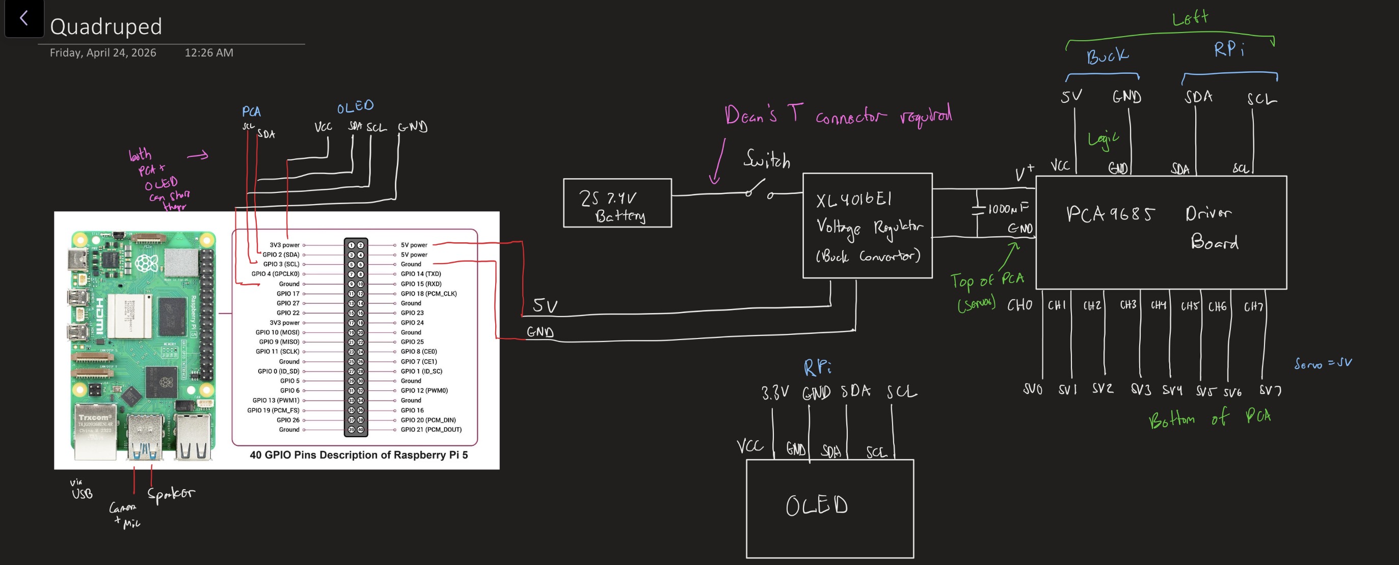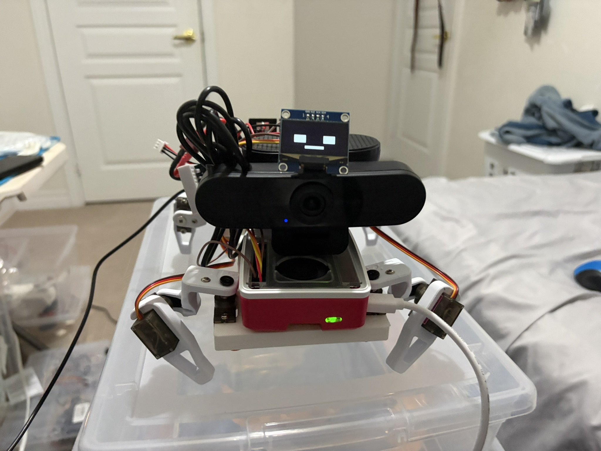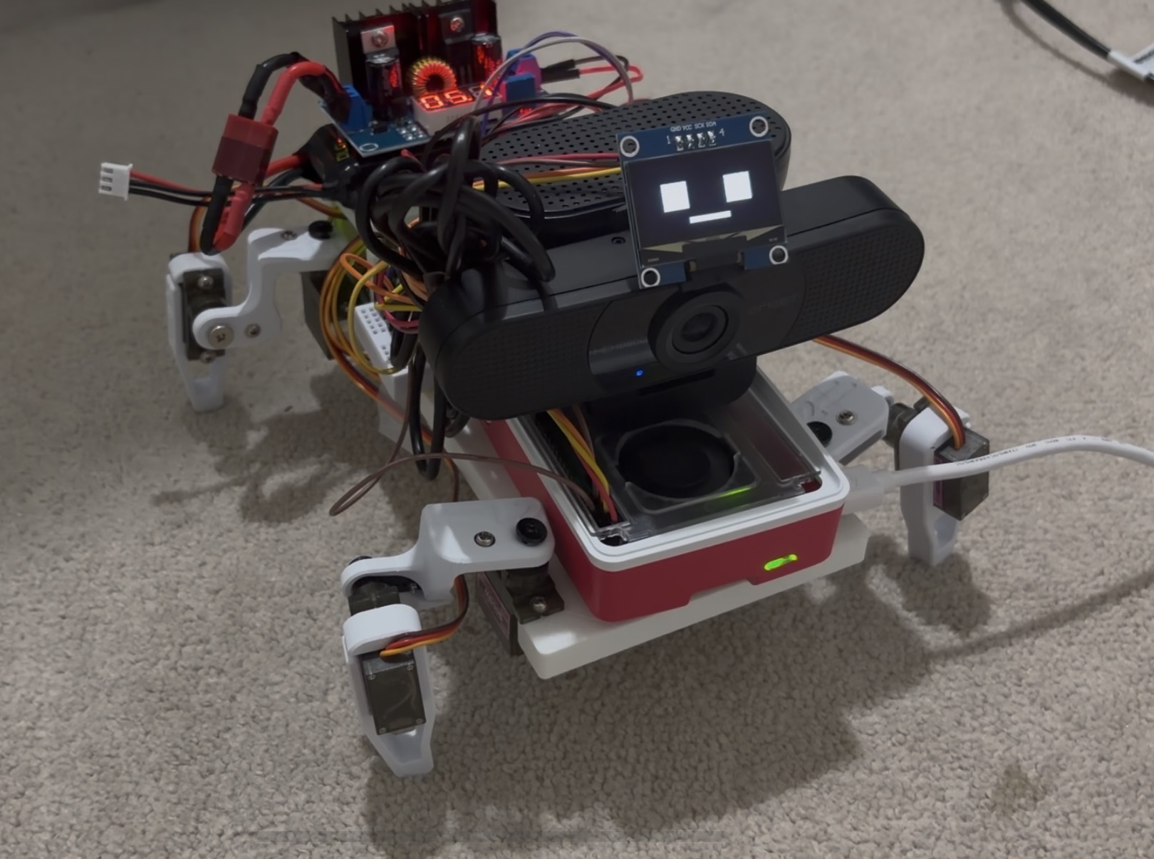 Space allocation inside the chassis Fitting a Raspberry Pi 5, PCA9685, buck converter, LiPo, OLED, camera, speaker, and sensor bay into a chassis small enough to be a quadruped, while leaving room for eight servo cables, required multiple CAD iterations and creative stacking. Every millimetre counted.
