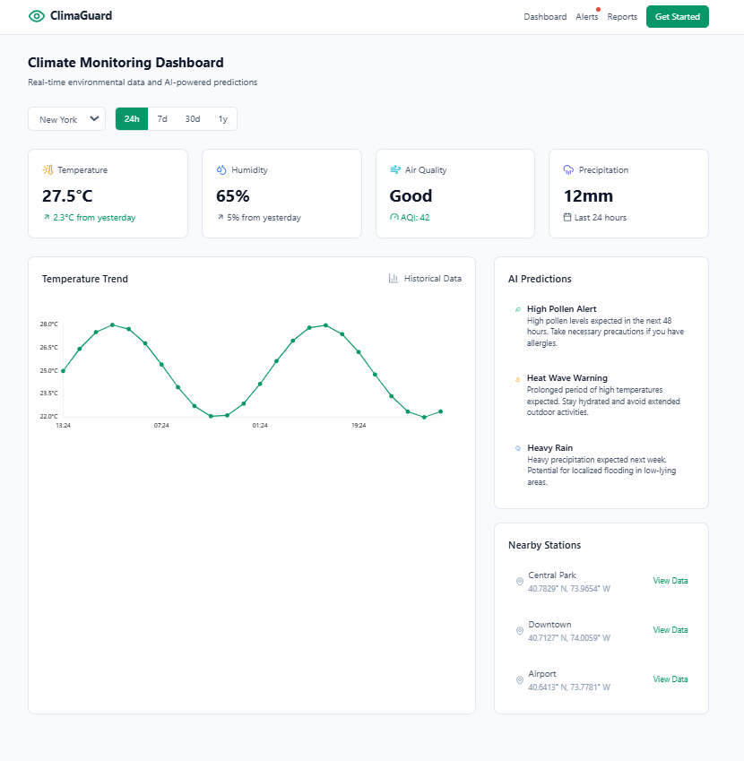 Climate change is one of the most pressing global challenges, leading to extreme weather events, rising sea levels, and ecosystem disruptions. The need for proactive solutions has never been more urgent. ClimaGuard is designed to bridge the gap between climate data and informed decision-making by using AI-powered predictive analytics and IoT-enabled monitoring.