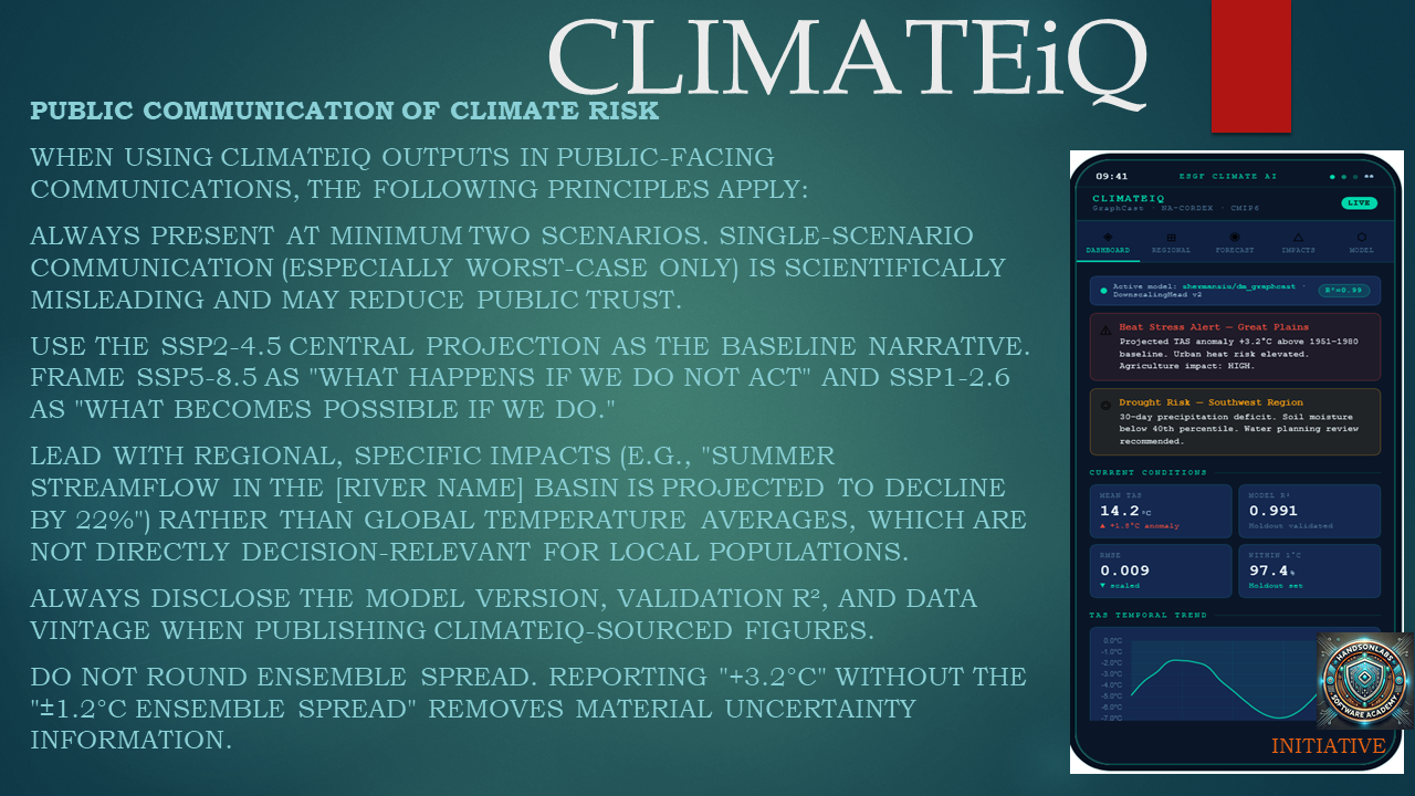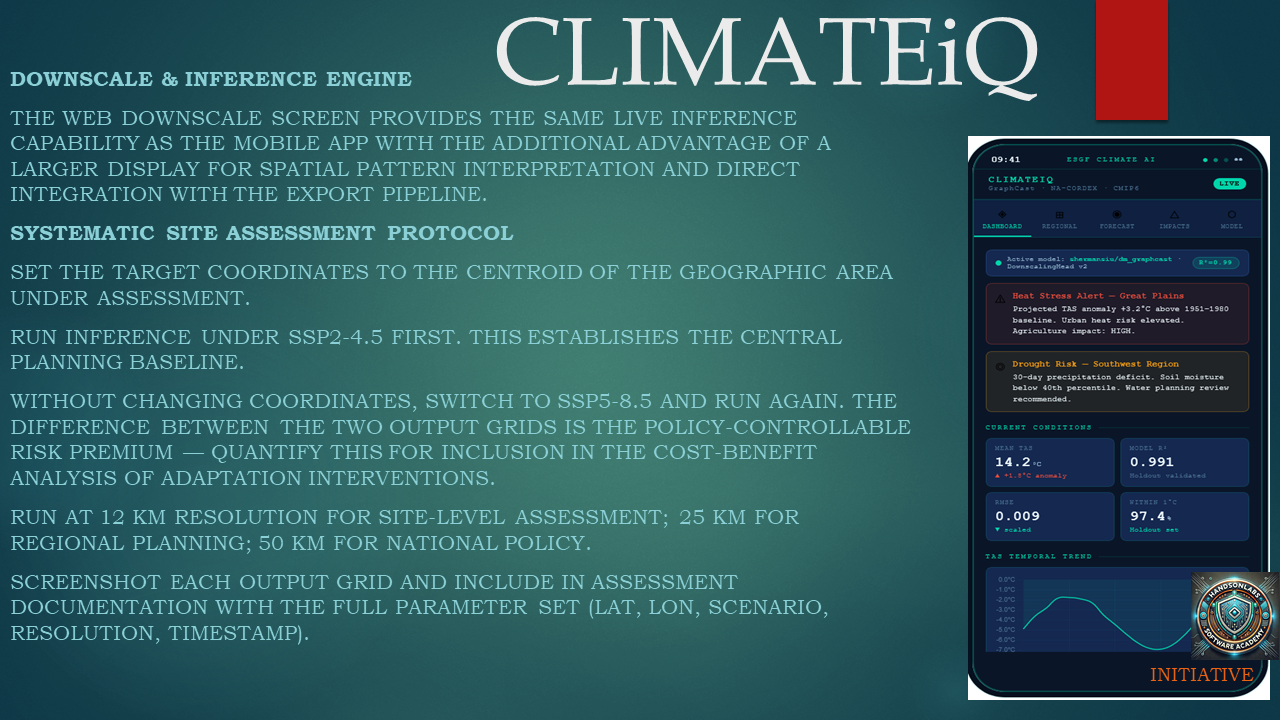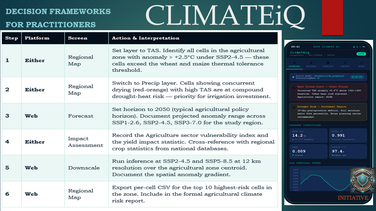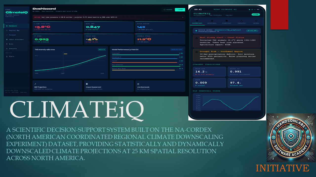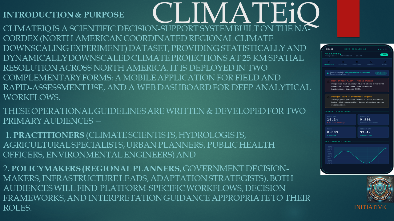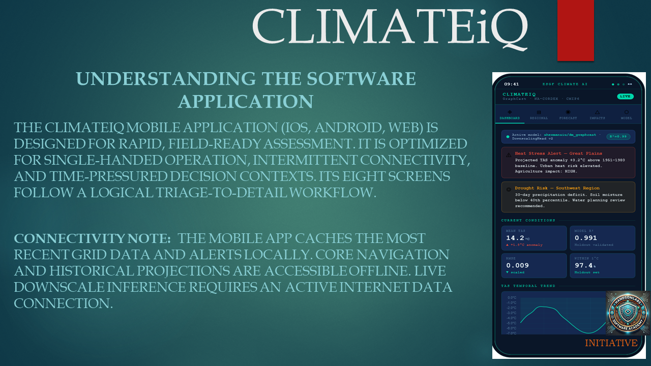 ClimateIQ is a decision-support system that translates regional climate model outputs into actionable, sector-focused guidance for practitioners and policymakers. The platform ingests NA-CORDEX forcing and ERA5 reanalysis data to produce statistically and dynamically downscaled climate projections at ~25 km resolution, implemented as both a field-oriented mobile application and a feature-rich web dashboard. NA-CORDEX ERA5 Technically, ClimateIQ combines a convolutional neural network for spatial pattern recognition with a long-short-term memory stage for temporal sequencing (CNN–LSTM), producing ensemble projections under five Shared Socioeconomic Pathway (SSP) scenarios for the period 2025–2100. The system emphasizes uncertainty transparency (ensemble spread and configurable confidence intervals), reproducibility (versioned inference weights and ERA5 traceability), and decision-relevance by exposing validation metrics (R², RMSE, cross-validation folds) alongside all operational outputs. Functionally, the mobile application supports rapid, offline-capable triage workflows and live downscale inference for point coordinates; the web dashboard supports multi-scenario analysis, model diagnostics, and exportable, citation-ready products. Analytical features include multi-layer spatial maps (TAS anomaly, precipitation, heat index, PDSI), a six-sector vulnerability scoreboard (agriculture, water, urban heat/public health, infrastructure, energy, ecosystems), milestone tables for threshold crossing years, and an alerts feed for threshold exceedances. Guidance is provided for both practitioner workflows (site assessments, reservoir yield modeling, urban heat adjustments) and policymaker workflows (rapid briefings, annual adaptation planning, cross-sector coordination). Limitations are stated explicitly: the 25 km grid cannot resolve sub-urban microclimates; variable coverage excludes some hazard indices; and residual model biases (RMSE ≈ 0.847°C) must be reported. ClimateIQ is presented as a scientific, reproducible bridge from ensemble climate science to operational adaptation planning designed to make uncertainty usable rather than opaque.