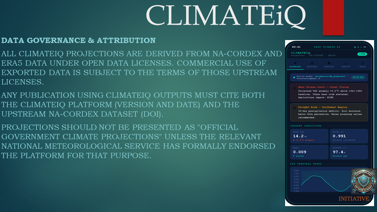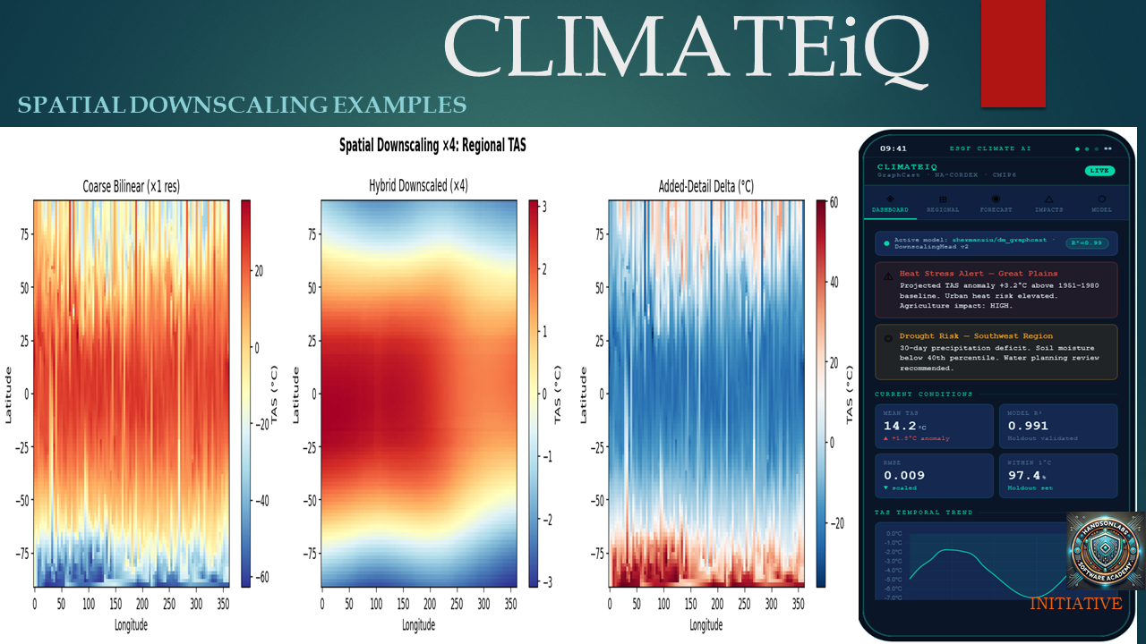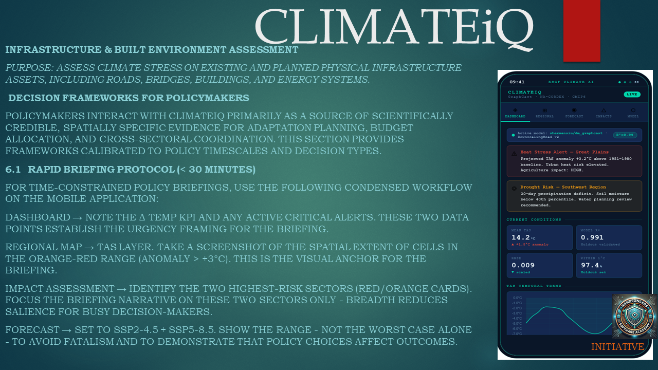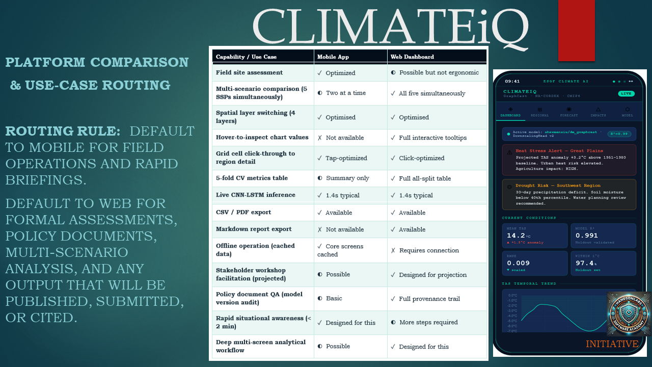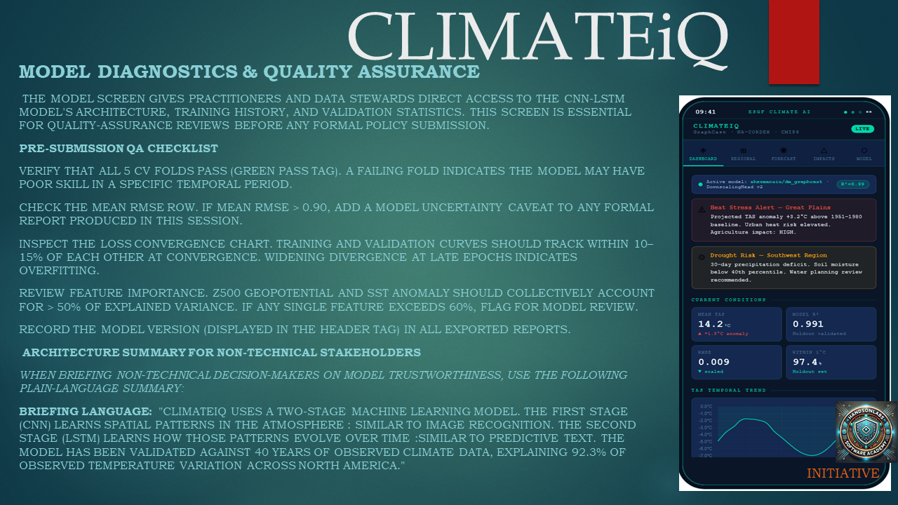 ClimateIQ is a decision-support system that translates regional climate model outputs into actionable, sector-focused guidance for practitioners and policymakers. The platform ingests NA-CORDEX forcing and ERA5 reanalysis data to produce statistically and dynamically downscaled climate projections at ~25 km resolution, implemented as both a field-oriented mobile application and a feature-rich web dashboard. NA-CORDEX ERA5 Technically, ClimateIQ combines a convolutional neural network for spatial pattern recognition with a long-short-term memory stage for temporal sequencing (CNN–LSTM), producing ensemble projections under five Shared Socioeconomic Pathway (SSP) scenarios for the period 2025–2100. The system emphasizes uncertainty transparency (ensemble spread and configurable confidence intervals), reproducibility (versioned inference weights and ERA5 traceability), and decision-relevance by exposing validation metrics (R², RMSE, cross-validation folds) alongside all operational outputs. Functionally, the mobile application supports rapid, offline-capable triage workflows and live downscale inference for point coordinates; the web dashboard supports multi-scenario analysis, model diagnostics, and exportable, citation-ready products. Analytical features include multi-layer spatial maps (TAS anomaly, precipitation, heat index, PDSI), a six-sector vulnerability scoreboard (agriculture, water, urban heat/public health, infrastructure, energy, ecosystems), milestone tables for threshold crossing years, and an alerts feed for threshold exceedances. Guidance is provided for both practitioner workflows (site assessments, reservoir yield modeling, urban heat adjustments) and policymaker workflows (rapid briefings, annual adaptation planning, cross-sector coordination). Limitations are stated explicitly: the 25 km grid cannot resolve sub-urban microclimates; variable coverage excludes some hazard indices; and residual model biases (RMSE ≈ 0.847°C) must be reported. ClimateIQ is presented as a scientific, reproducible bridge from ensemble climate science to operational adaptation planning designed to make uncertainty usable rather than opaque.