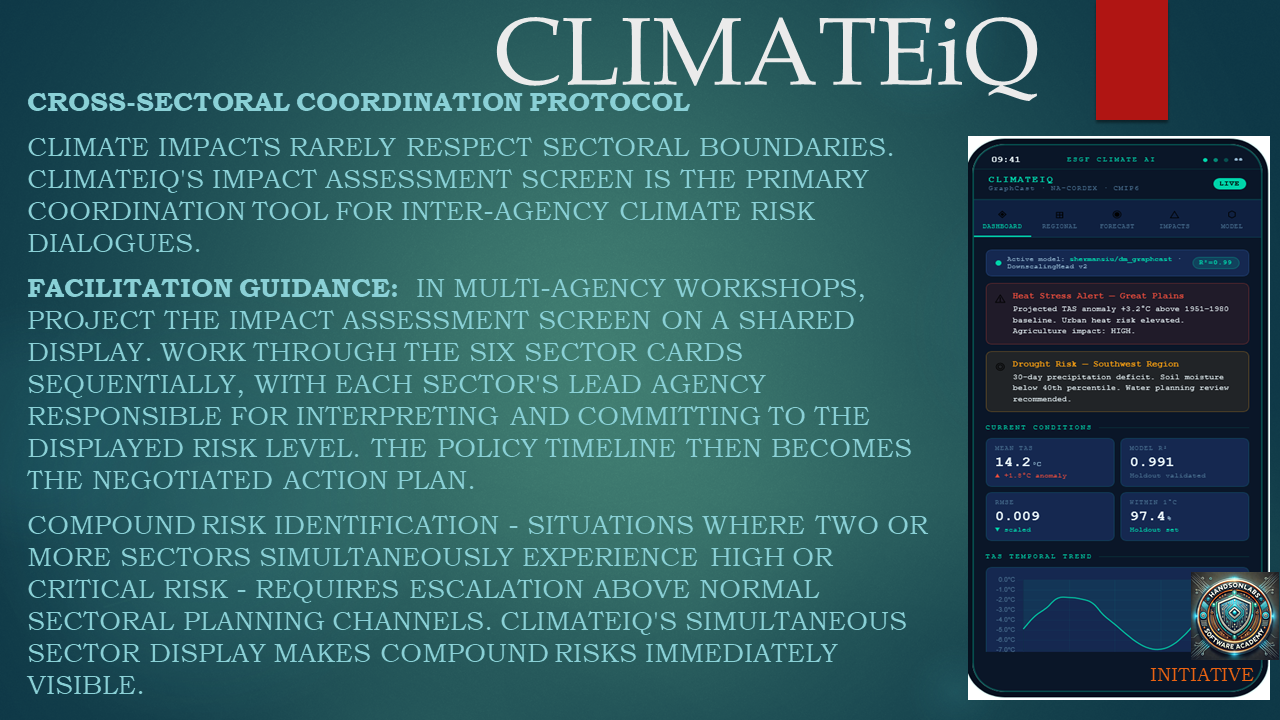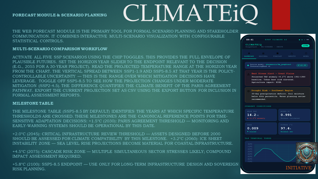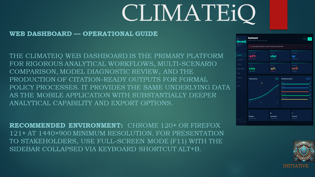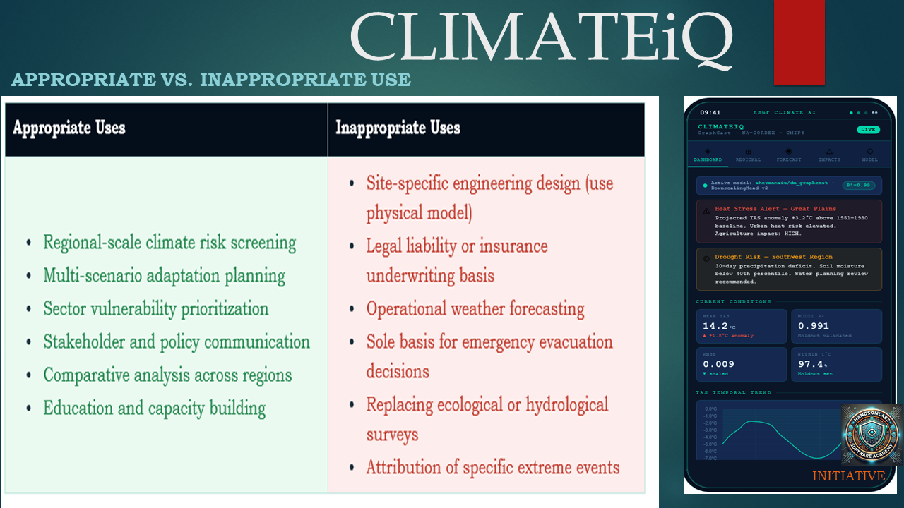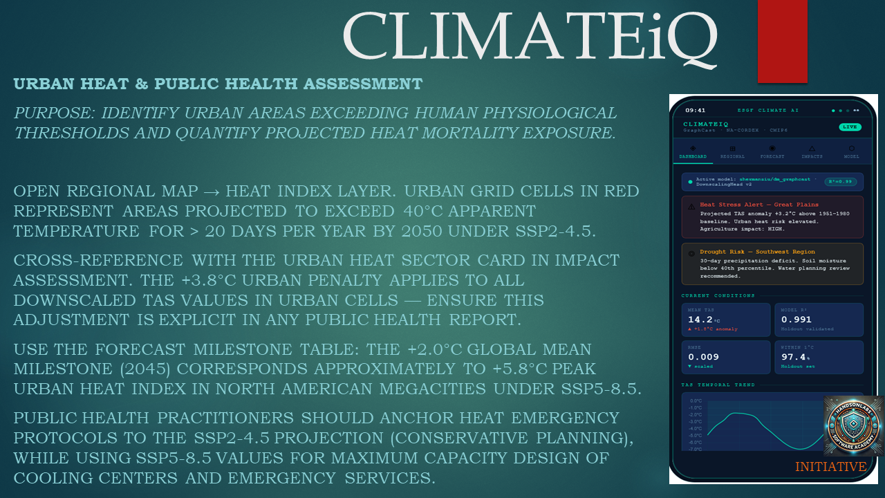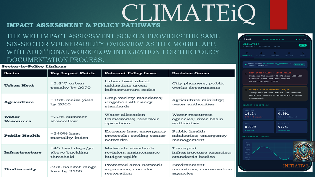 ClimateIQ is a decision-support system that translates regional climate model outputs into actionable, sector-focused guidance for practitioners and policymakers. The platform ingests NA-CORDEX forcing and ERA5 reanalysis data to produce statistically and dynamically downscaled climate projections at ~25 km resolution, implemented as both a field-oriented mobile application and a feature-rich web dashboard. NA-CORDEX ERA5 Technically, ClimateIQ combines a convolutional neural network for spatial pattern recognition with a long-short-term memory stage for temporal sequencing (CNN–LSTM), producing ensemble projections under five Shared Socioeconomic Pathway (SSP) scenarios for the period 2025–2100. The system emphasizes uncertainty transparency (ensemble spread and configurable confidence intervals), reproducibility (versioned inference weights and ERA5 traceability), and decision-relevance by exposing validation metrics (R², RMSE, cross-validation folds) alongside all operational outputs. Functionally, the mobile application supports rapid, offline-capable triage workflows and live downscale inference for point coordinates; the web dashboard supports multi-scenario analysis, model diagnostics, and exportable, citation-ready products. Analytical features include multi-layer spatial maps (TAS anomaly, precipitation, heat index, PDSI), a six-sector vulnerability scoreboard (agriculture, water, urban heat/public health, infrastructure, energy, ecosystems), milestone tables for threshold crossing years, and an alerts feed for threshold exceedances. Guidance is provided for both practitioner workflows (site assessments, reservoir yield modeling, urban heat adjustments) and policymaker workflows (rapid briefings, annual adaptation planning, cross-sector coordination). Limitations are stated explicitly: the 25 km grid cannot resolve sub-urban microclimates; variable coverage excludes some hazard indices; and residual model biases (RMSE ≈ 0.847°C) must be reported. ClimateIQ is presented as a scientific, reproducible bridge from ensemble climate science to operational adaptation planning designed to make uncertainty usable rather than opaque.