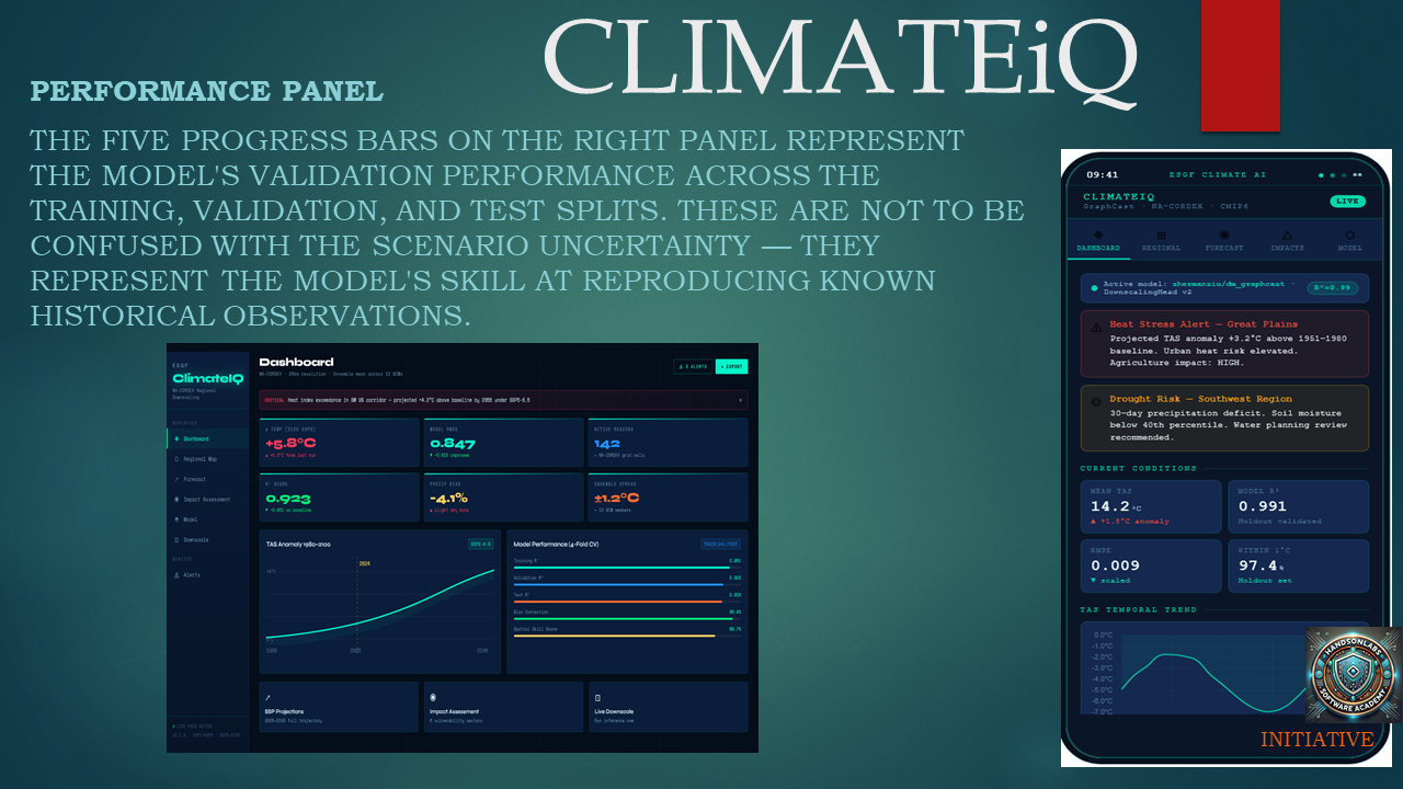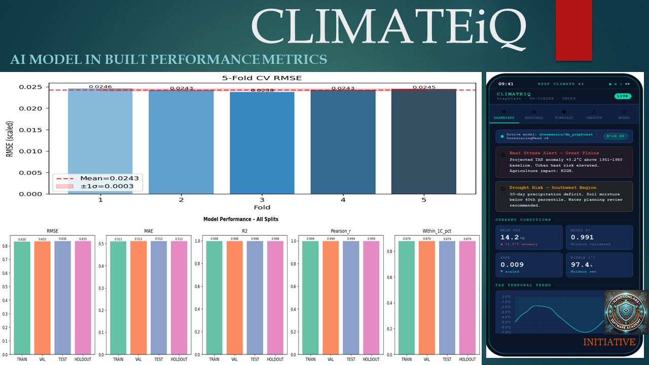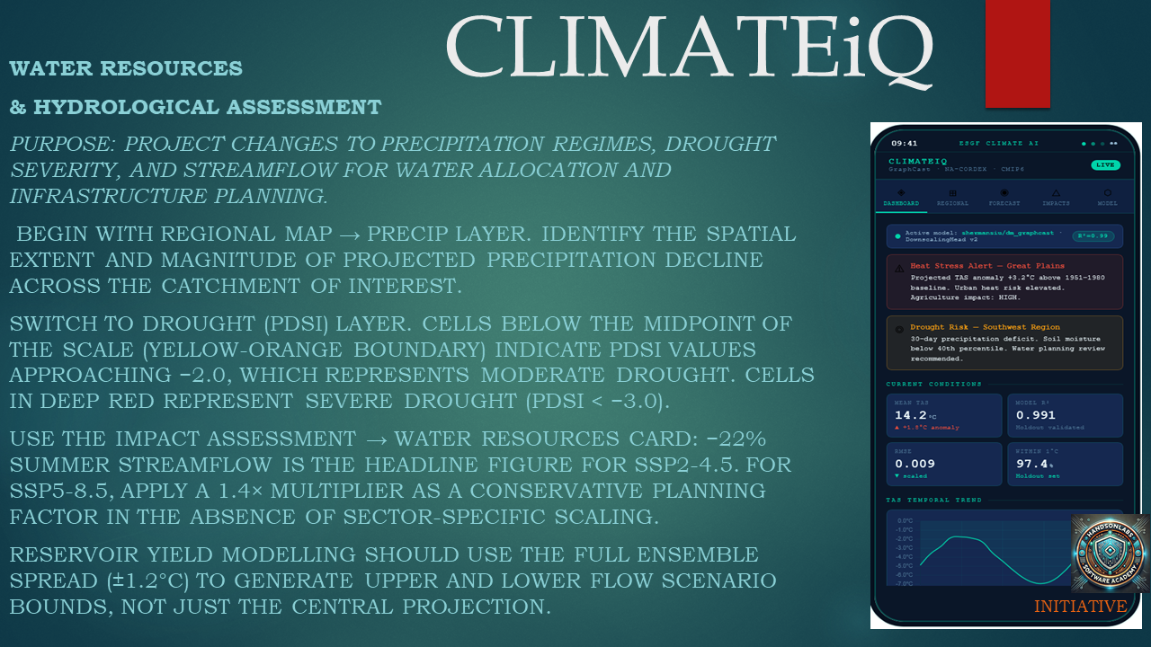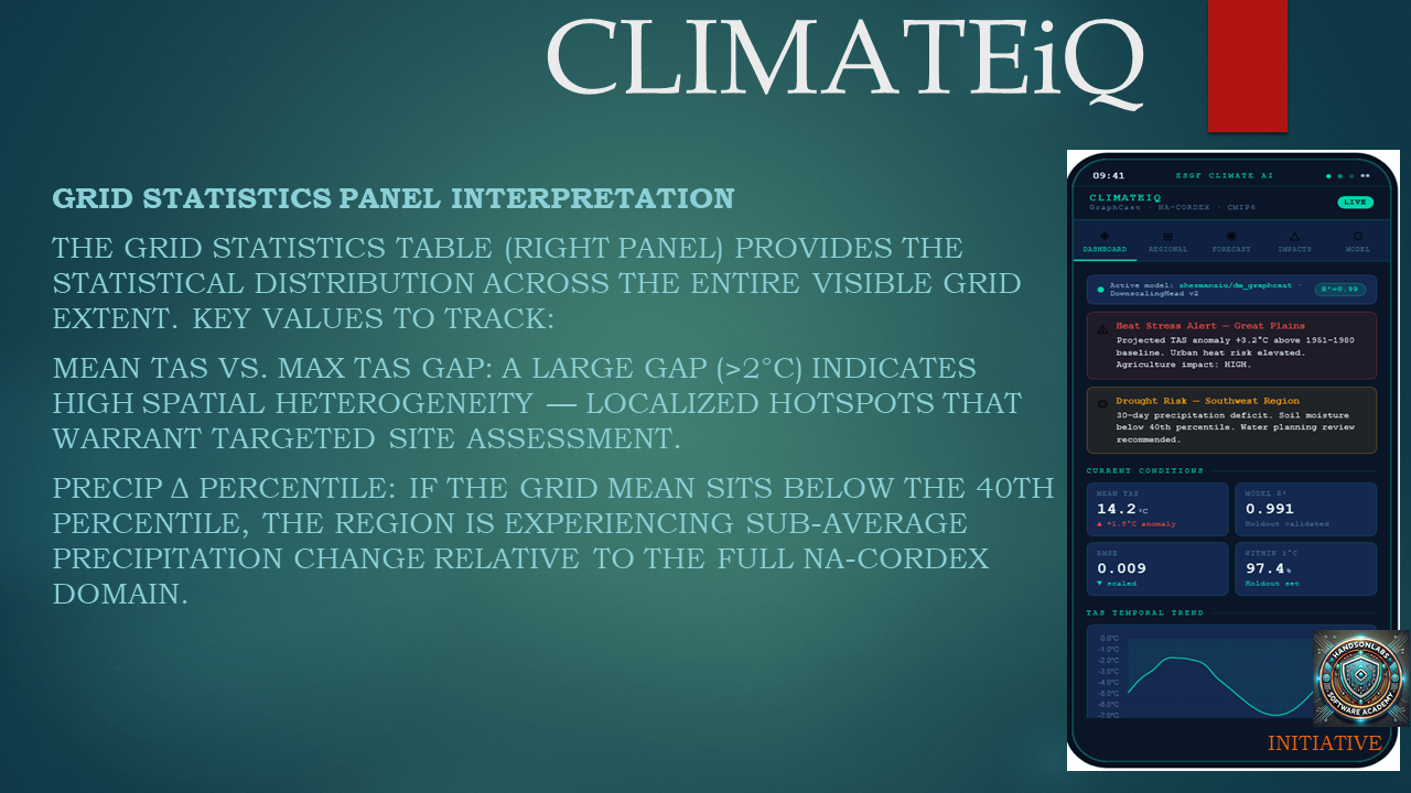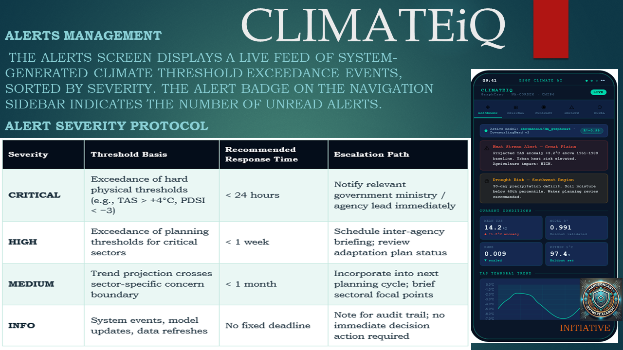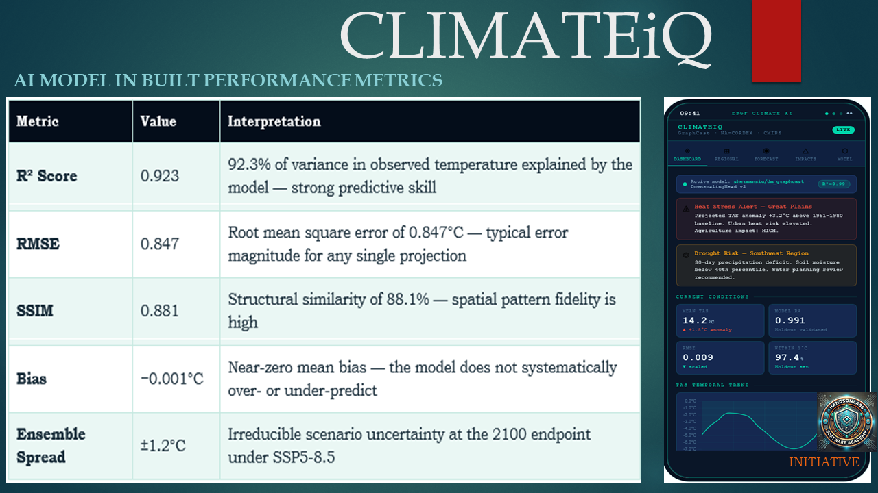 ClimateIQ is a decision-support system that translates regional climate model outputs into actionable, sector-focused guidance for practitioners and policymakers. The platform ingests NA-CORDEX forcing and ERA5 reanalysis data to produce statistically and dynamically downscaled climate projections at ~25 km resolution, implemented as both a field-oriented mobile application and a feature-rich web dashboard. NA-CORDEX ERA5 Technically, ClimateIQ combines a convolutional neural network for spatial pattern recognition with a long-short-term memory stage for temporal sequencing (CNN–LSTM), producing ensemble projections under five Shared Socioeconomic Pathway (SSP) scenarios for the period 2025–2100. The system emphasizes uncertainty transparency (ensemble spread and configurable confidence intervals), reproducibility (versioned inference weights and ERA5 traceability), and decision-relevance by exposing validation metrics (R², RMSE, cross-validation folds) alongside all operational outputs. Functionally, the mobile application supports rapid, offline-capable triage workflows and live downscale inference for point coordinates; the web dashboard supports multi-scenario analysis, model diagnostics, and exportable, citation-ready products. Analytical features include multi-layer spatial maps (TAS anomaly, precipitation, heat index, PDSI), a six-sector vulnerability scoreboard (agriculture, water, urban heat/public health, infrastructure, energy, ecosystems), milestone tables for threshold crossing years, and an alerts feed for threshold exceedances. Guidance is provided for both practitioner workflows (site assessments, reservoir yield modeling, urban heat adjustments) and policymaker workflows (rapid briefings, annual adaptation planning, cross-sector coordination). Limitations are stated explicitly: the 25 km grid cannot resolve sub-urban microclimates; variable coverage excludes some hazard indices; and residual model biases (RMSE ≈ 0.847°C) must be reported. ClimateIQ is presented as a scientific, reproducible bridge from ensemble climate science to operational adaptation planning designed to make uncertainty usable rather than opaque.