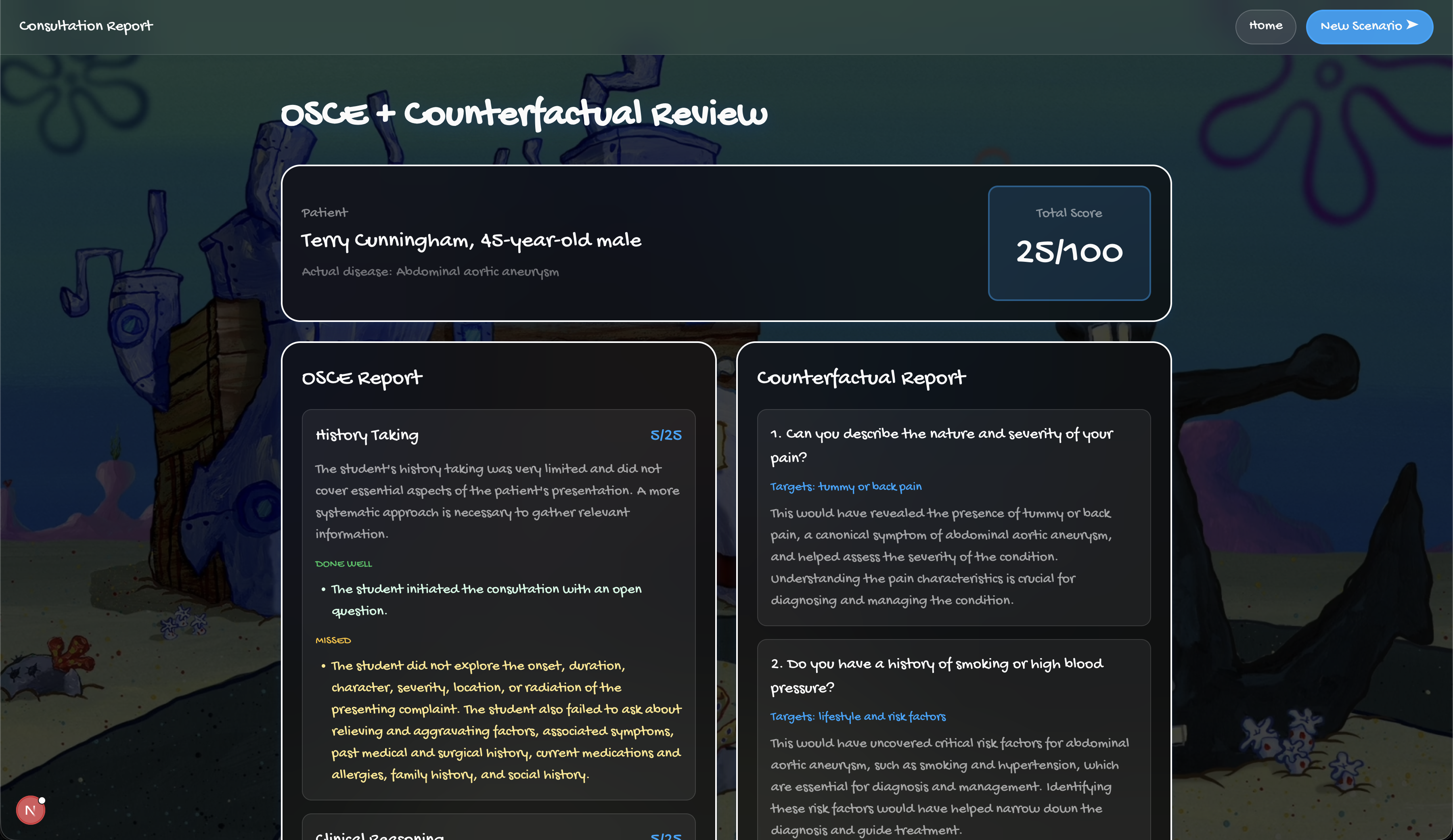 A second Groq call generates the counterfactual, specific questions missed, why each matters clinically, and the ideal consultation order. Students do not learn from scores. They learn from "you never asked about the radiation of the pain, and that was the single most important question."