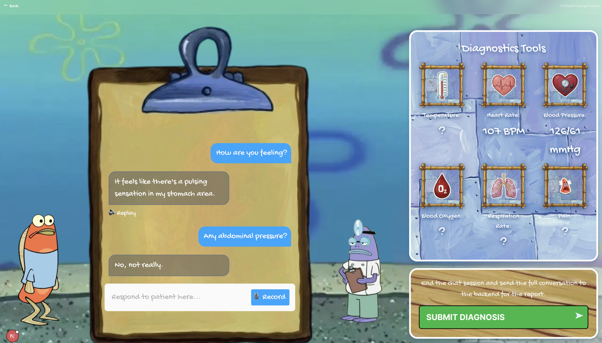 Examination findings layer. The patient describes what the doctor would find on examination ("when you press there it's very tender"), bridging history-taking practice into physical examination reasoning without a simulation lab.
