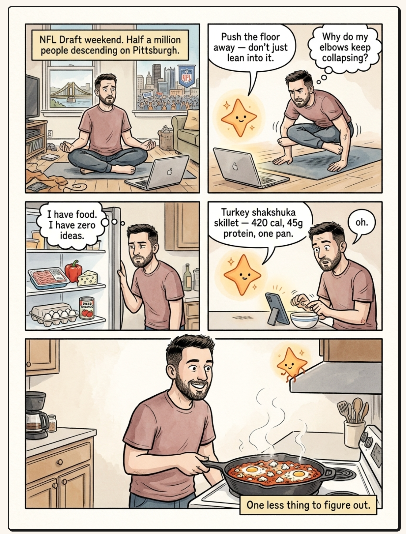 - 4–6 panel comic strip covering the whole day's arc — not one moment