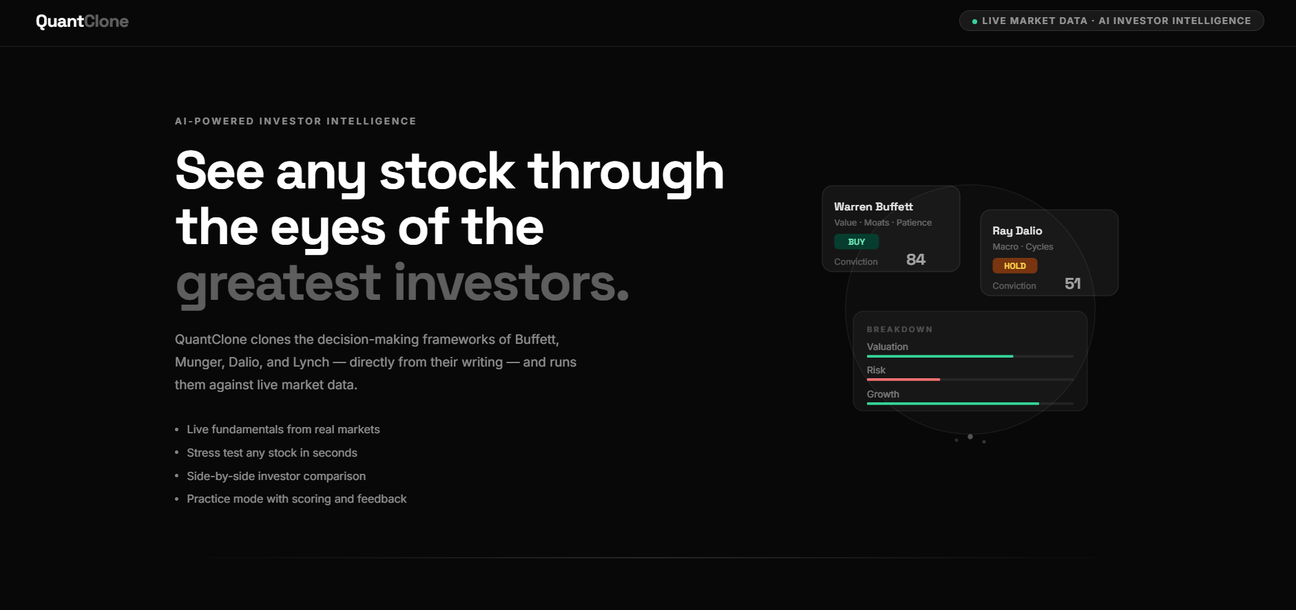QuantClone was inspired by a simple idea: most investing tools give you data, but not the thinking process behind great decisions. We wanted to simulate how investors like Warren Buffett and Ray Dalio would evaluate a stock, basically making a "clone" of the top investors. This is something no one has ever done before; people have made AI's that give generic advice or built something to give the most trending stock today, but no one built a webstite before that not only gives results based off of the mindsets of investors, but also let's you compare between investors to give you the best stock options.