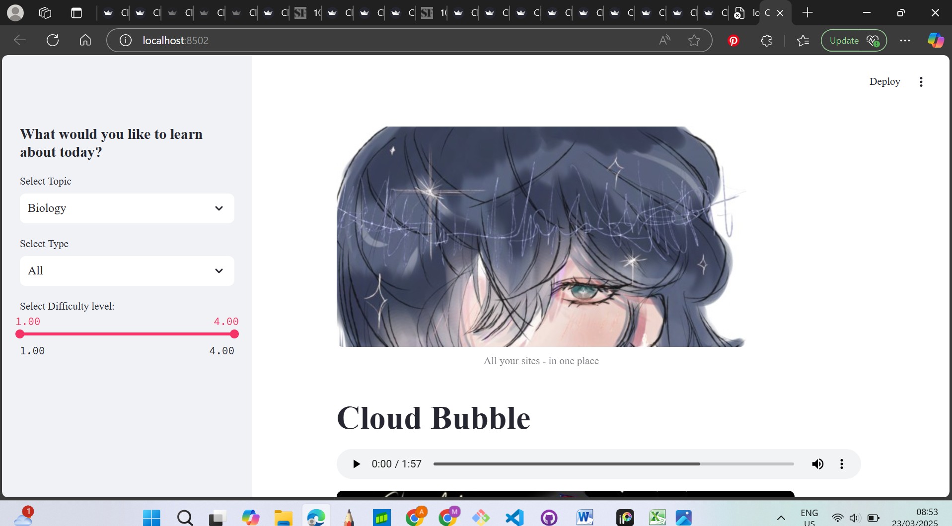 Trying to use JavaFx and java to write the program at first then gave up on the idea. Not planning how much time to allocate for designing, writing the actual and debugging. Using VScode and commiting. It's my first time using streamlit, so it took me sometime to get used to it, but i found it great. Just a bit sad python doesnt make use of gifs