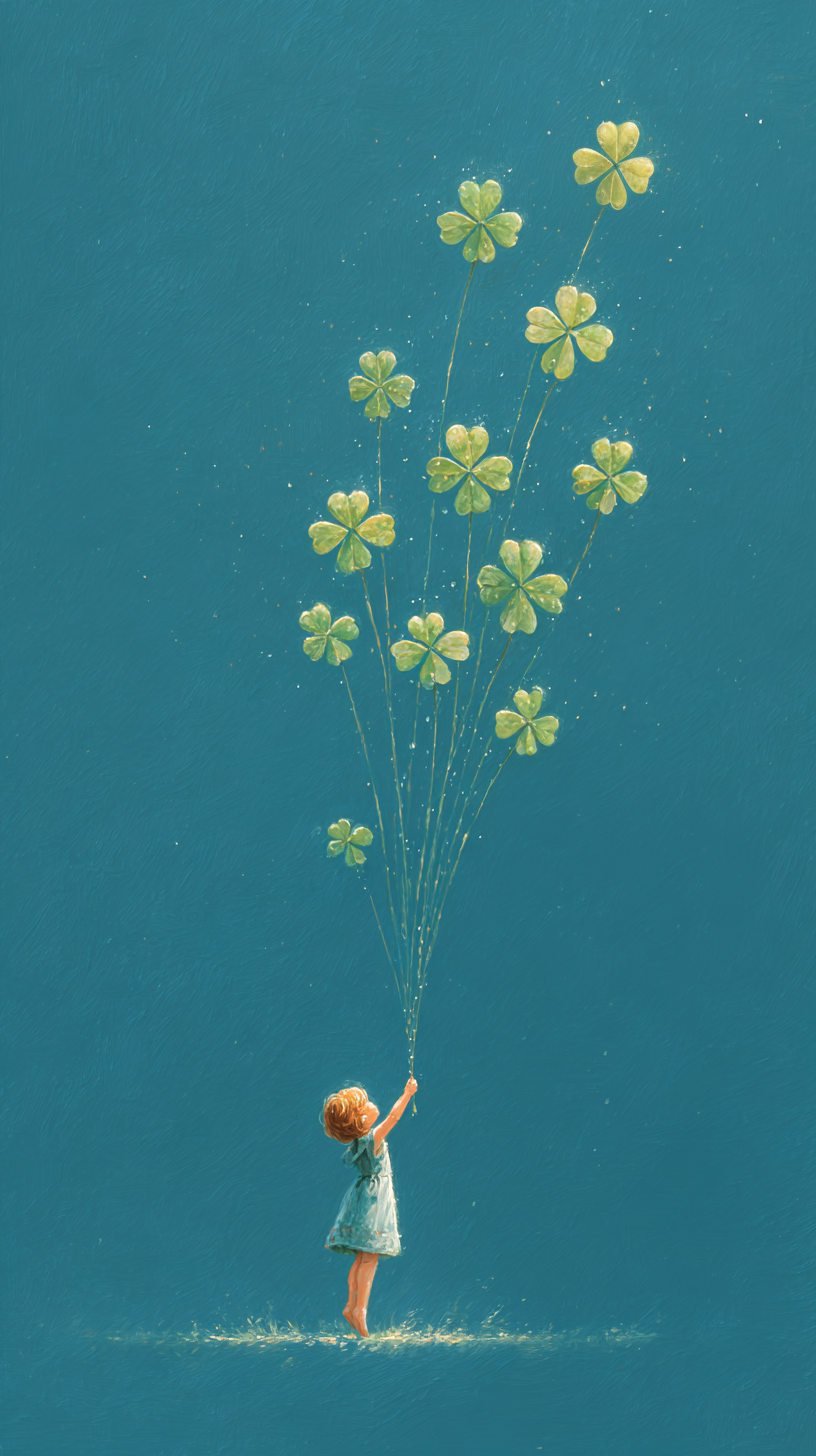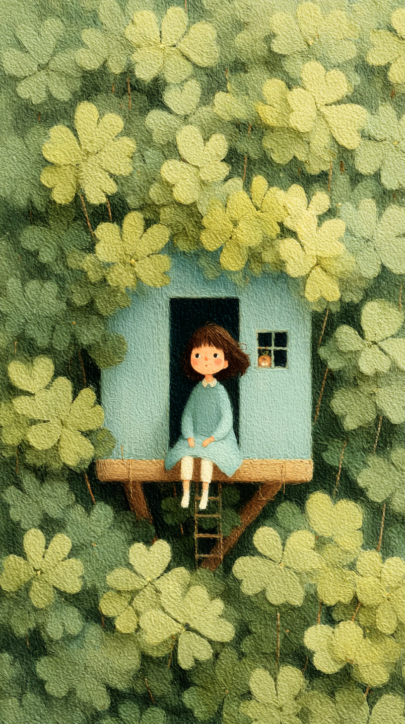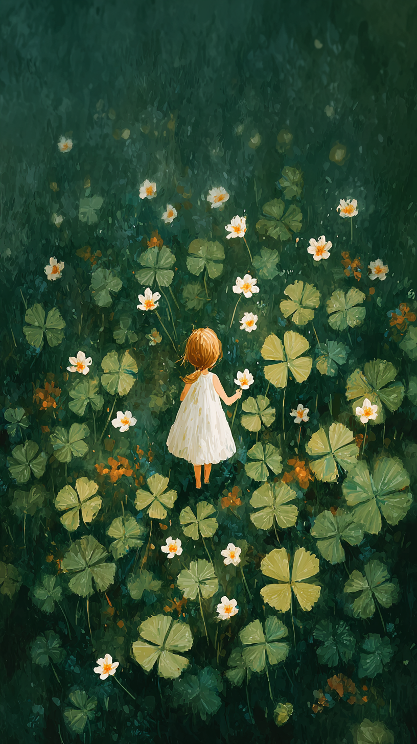 A small girl stands in a forest of four-leaf clovers, surrounded by quiet luck and little miracles under her feet.