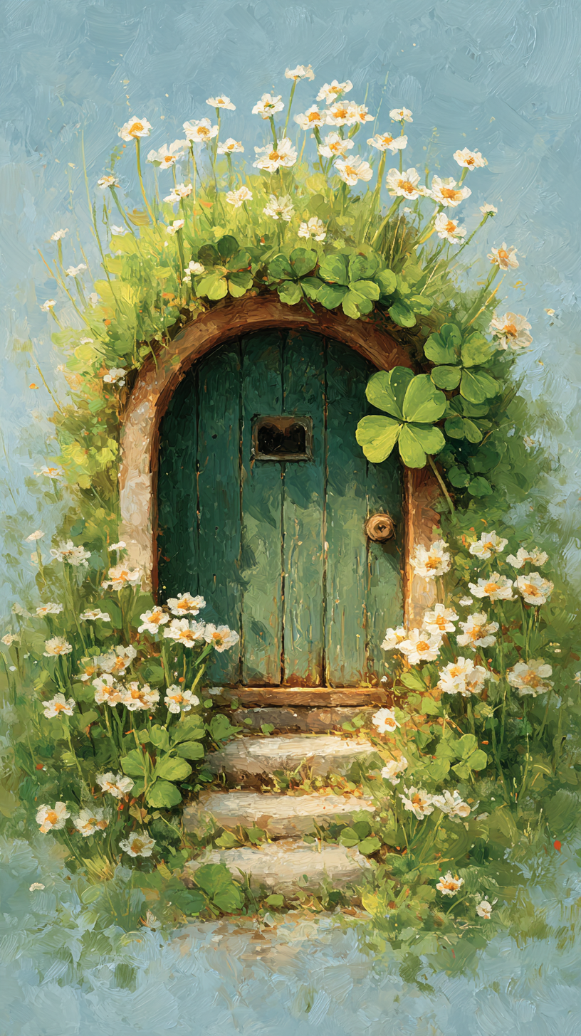 A clover-framed door waits at the edge of the grove, inviting anyone brave enough to step into their own little miracle.