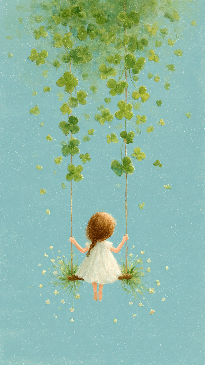 A child on a clover swing drifts upward, carried by soft green leaves and the feeling that anything might be possible.