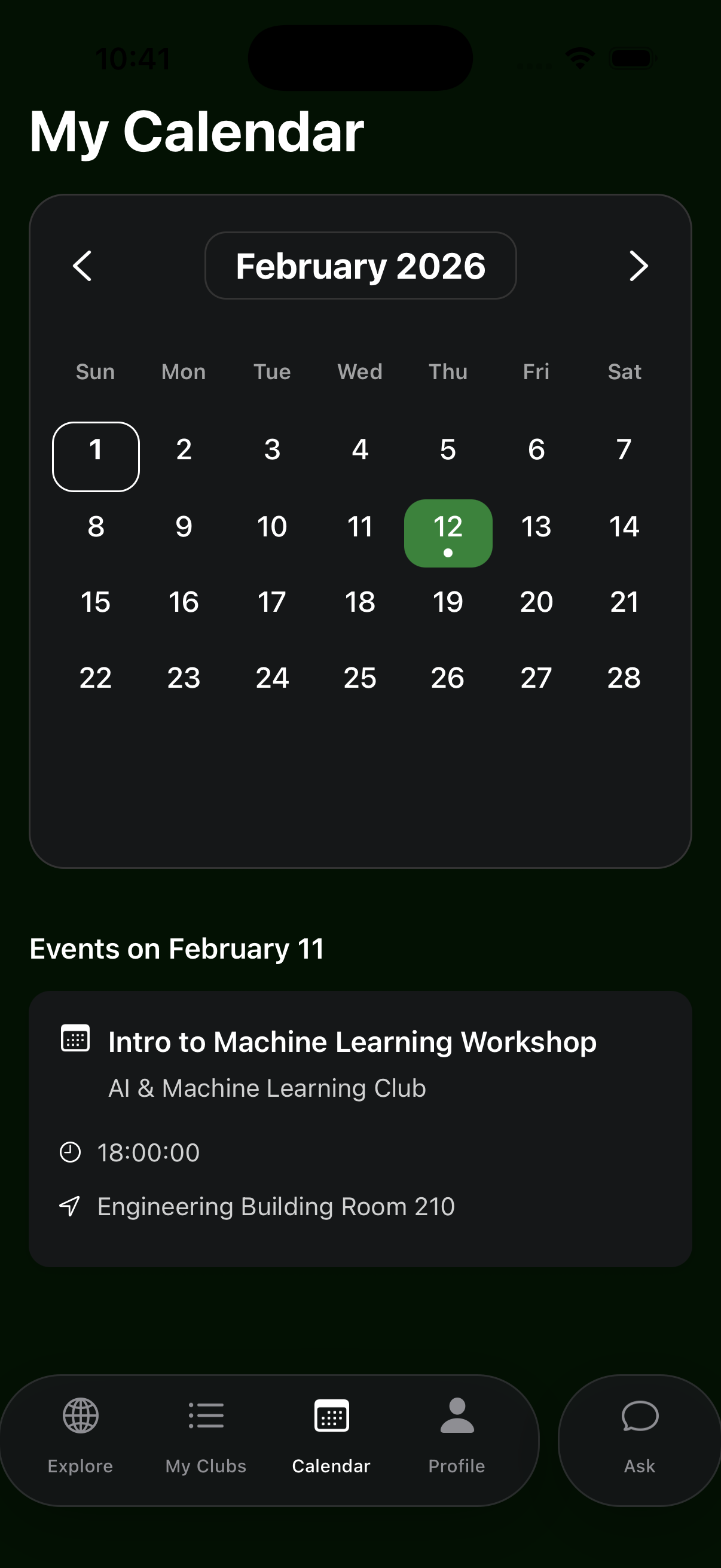 My Calendar page (Dark mode)