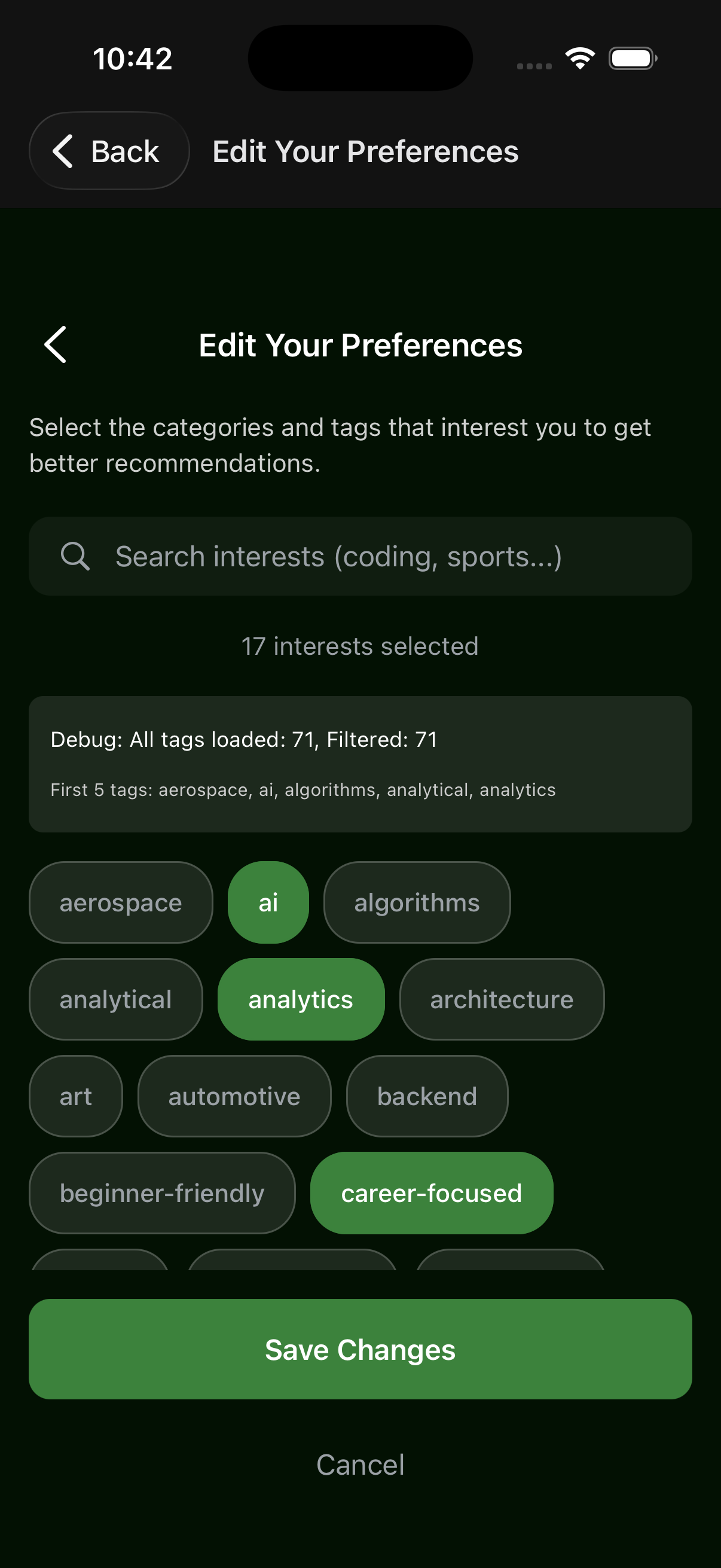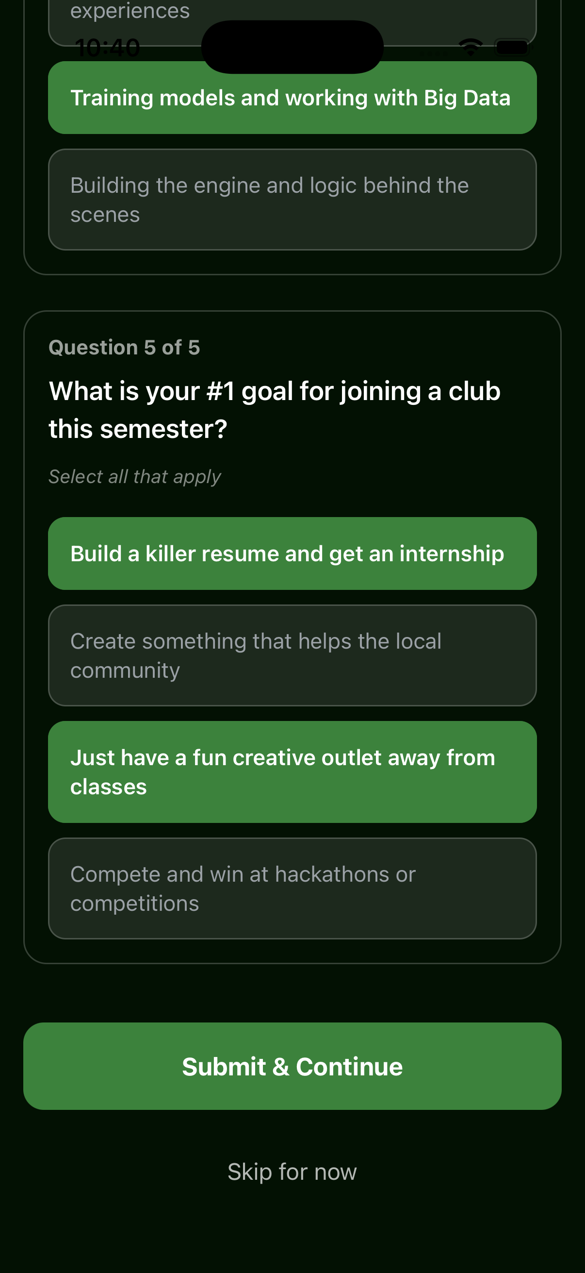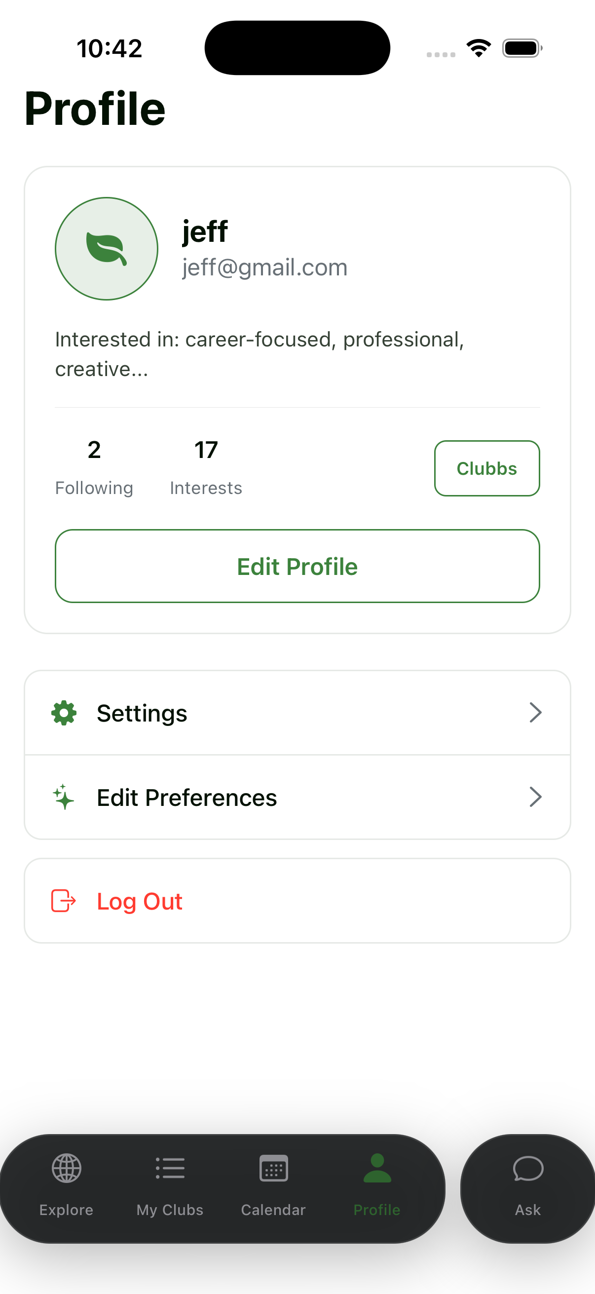 Clubbs transforms a daunting and lengthy club directory into a personalized experience. When users first sign up, they are asked to complete a quick quiz about their interests and preferences. The app then creates a tailored feed of recommendations. Users can browse and filter by tags, follow clubs they are interested in, and save events to an in-app calendar function so that opportunities don’t get buried under the busy experience of college life. We also included a chatbot function that provides recommendations in a conversational way. Discovery feels more like talking to your smart friend rather than simply browsing through information.