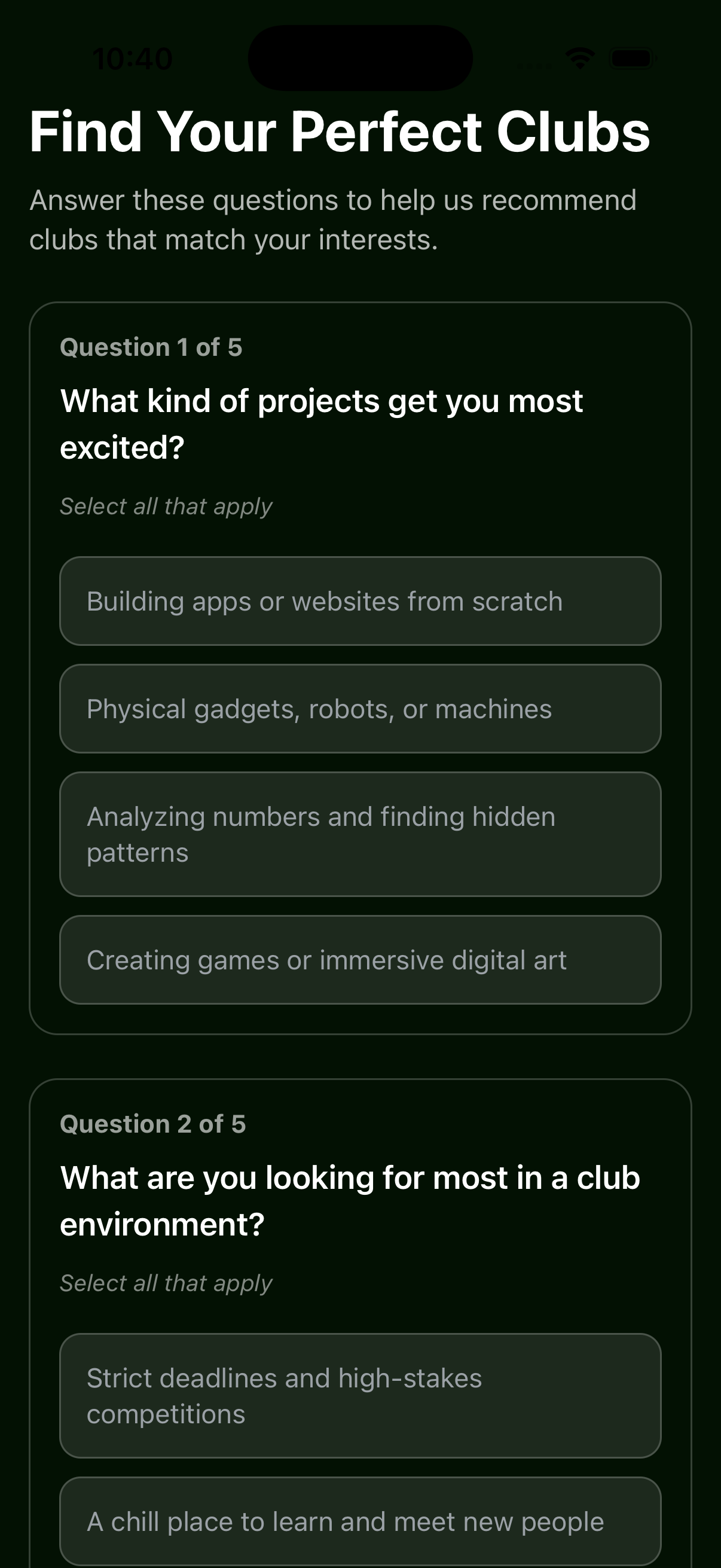 Preference Quiz page (Dark mode)