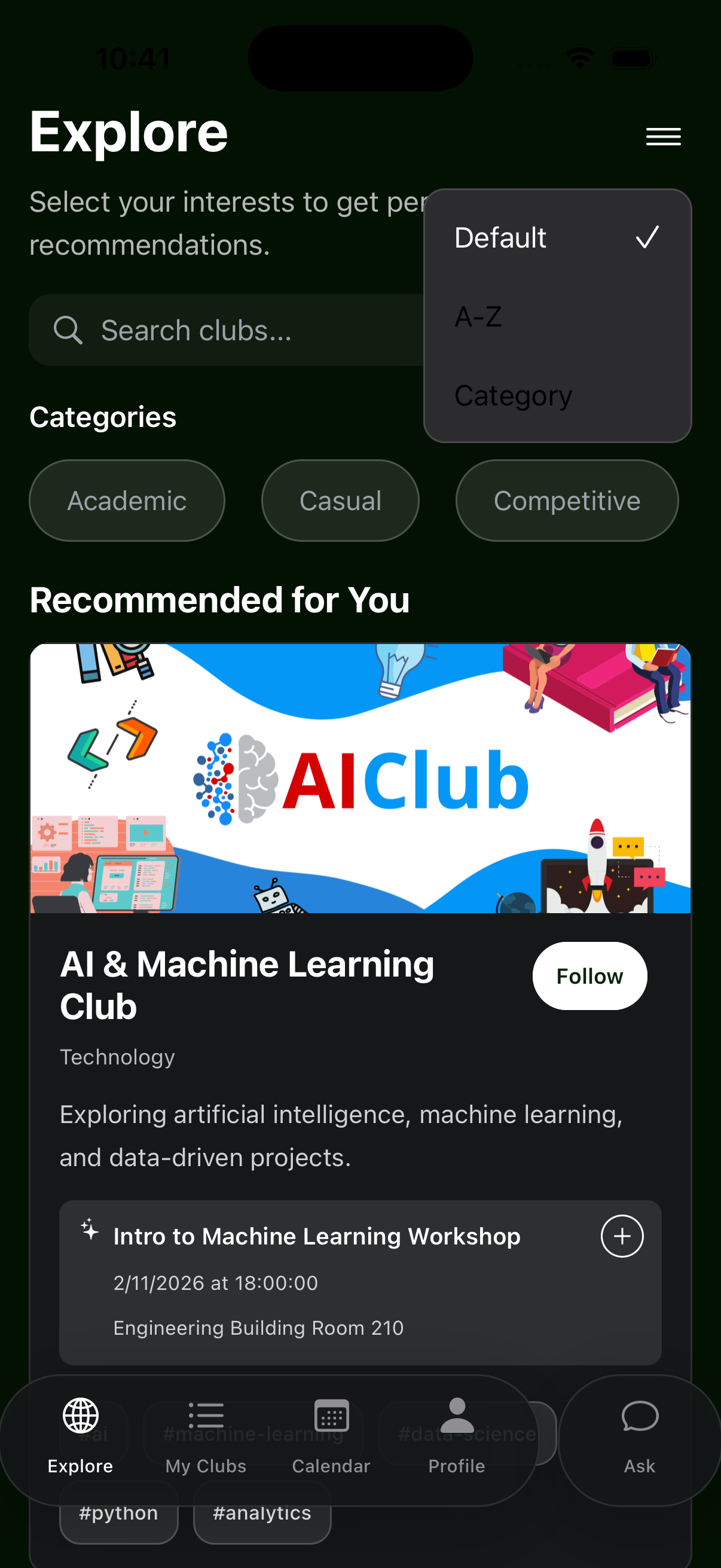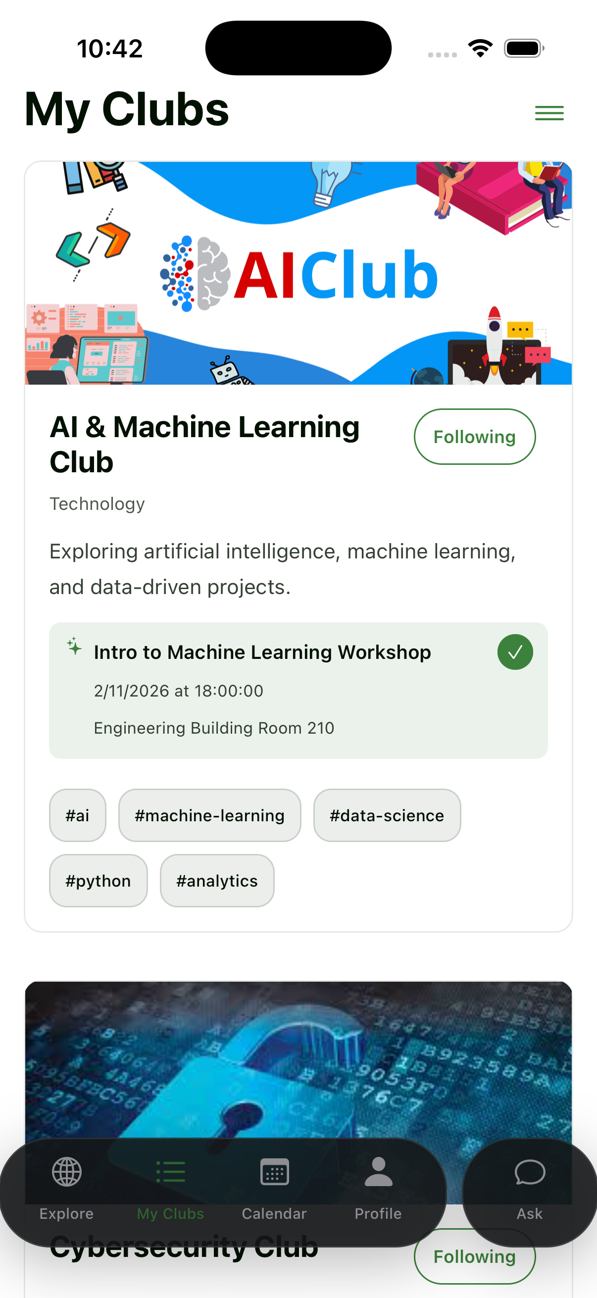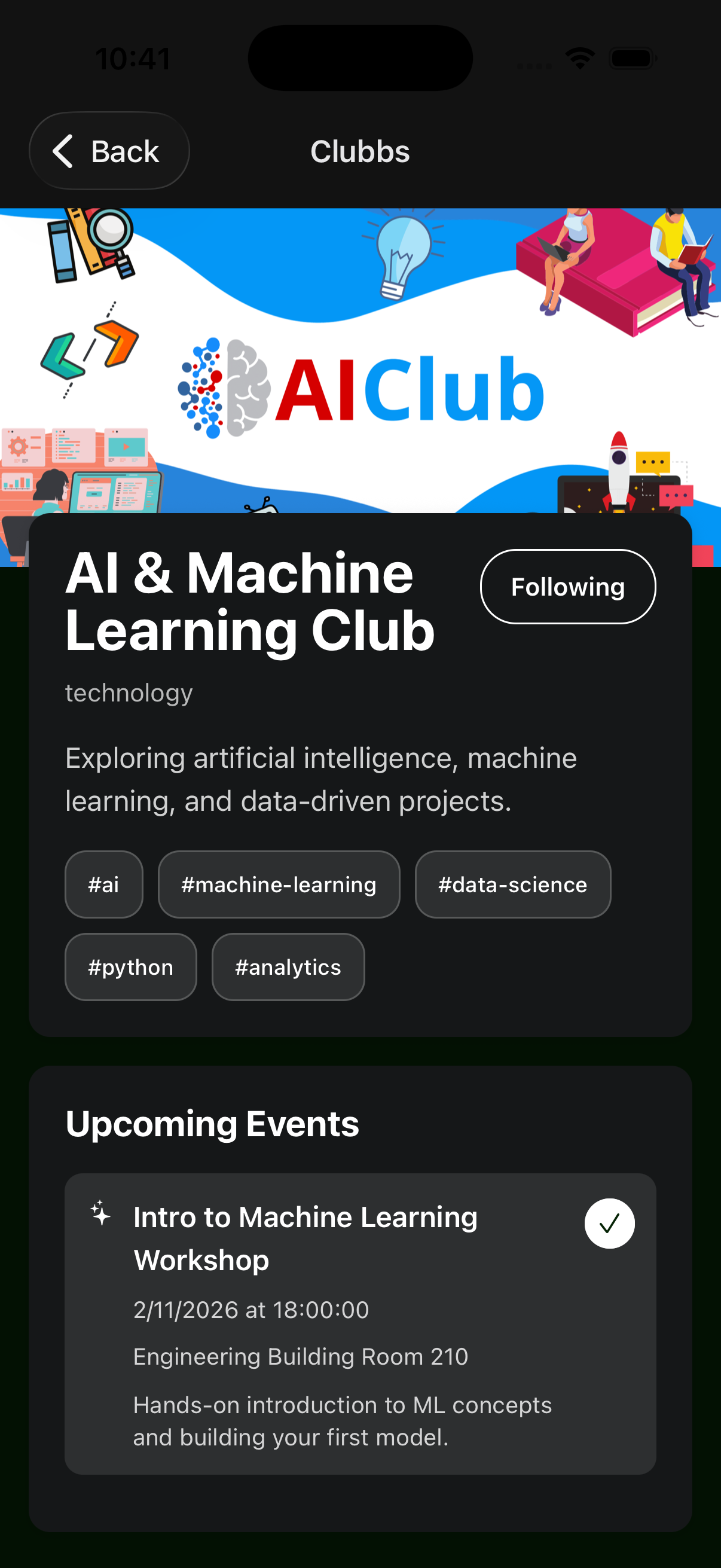 At its heart, Clubs is about belonging. It’s not just a tool to browse organizations. It’s a guide for students who want to explore, connect, and find the spaces where they feel most at home. By making discovery easier and more personal, we hope to turn curiosity into community, one club at a time.