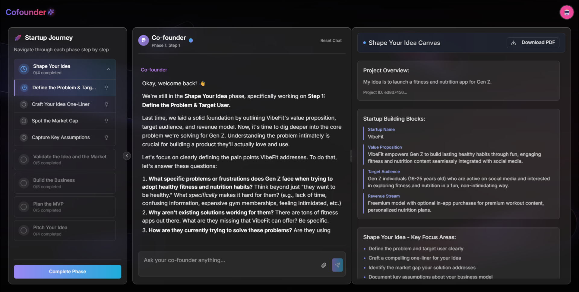 The core innovation lies in a pre-prompt system that lets the AI guide rich, structured conversations step by step, generating business outputs in real time. The journey is divided into 5 startup-building phases, each with clear, actionable steps.