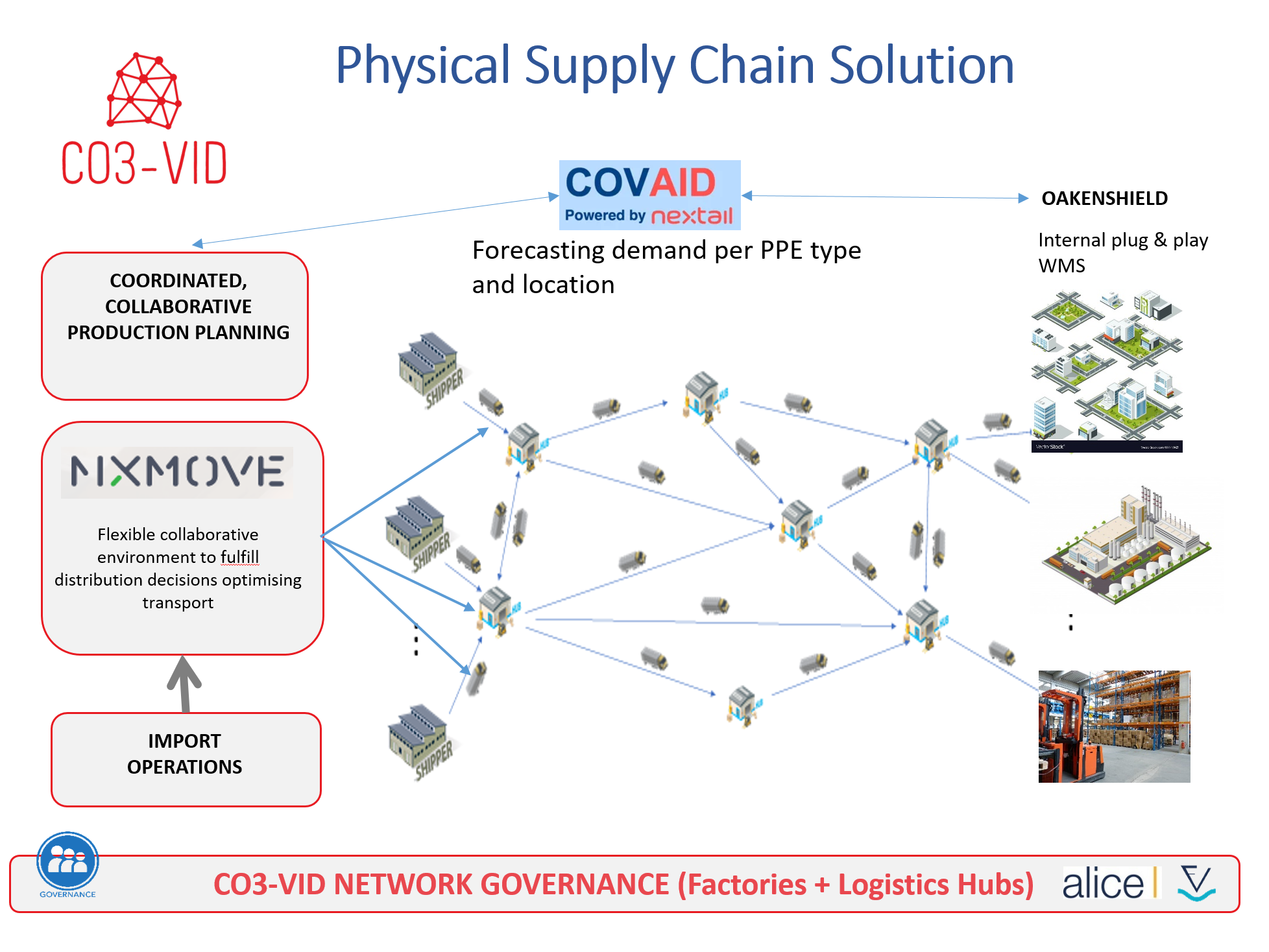 CO3-VID project proposes a complete sound and solid solution to build an efficient collaborative intelligent logistics network for the decentralised production of PPEs, and its distribution to the multiple locations where this equipment is needed. CO3-VID builds-on different already consolidated solutions covering from the daily forecast of the needs in each of the locations, combining artificial intelligence and prescriptive analytics (Nextail - COVAID), to the intelligent coordinated planning of decentralised production, and the management of a collaborative distribution network involving multiple transport service providers, operators and logistics hubs, inspired on the physical internet concept (MIXMOVE Match). The local stock position would be guaranteed through an easy plug&play warehouse management system that will be available for any production site and logistic hub in the network (Oakenshield).