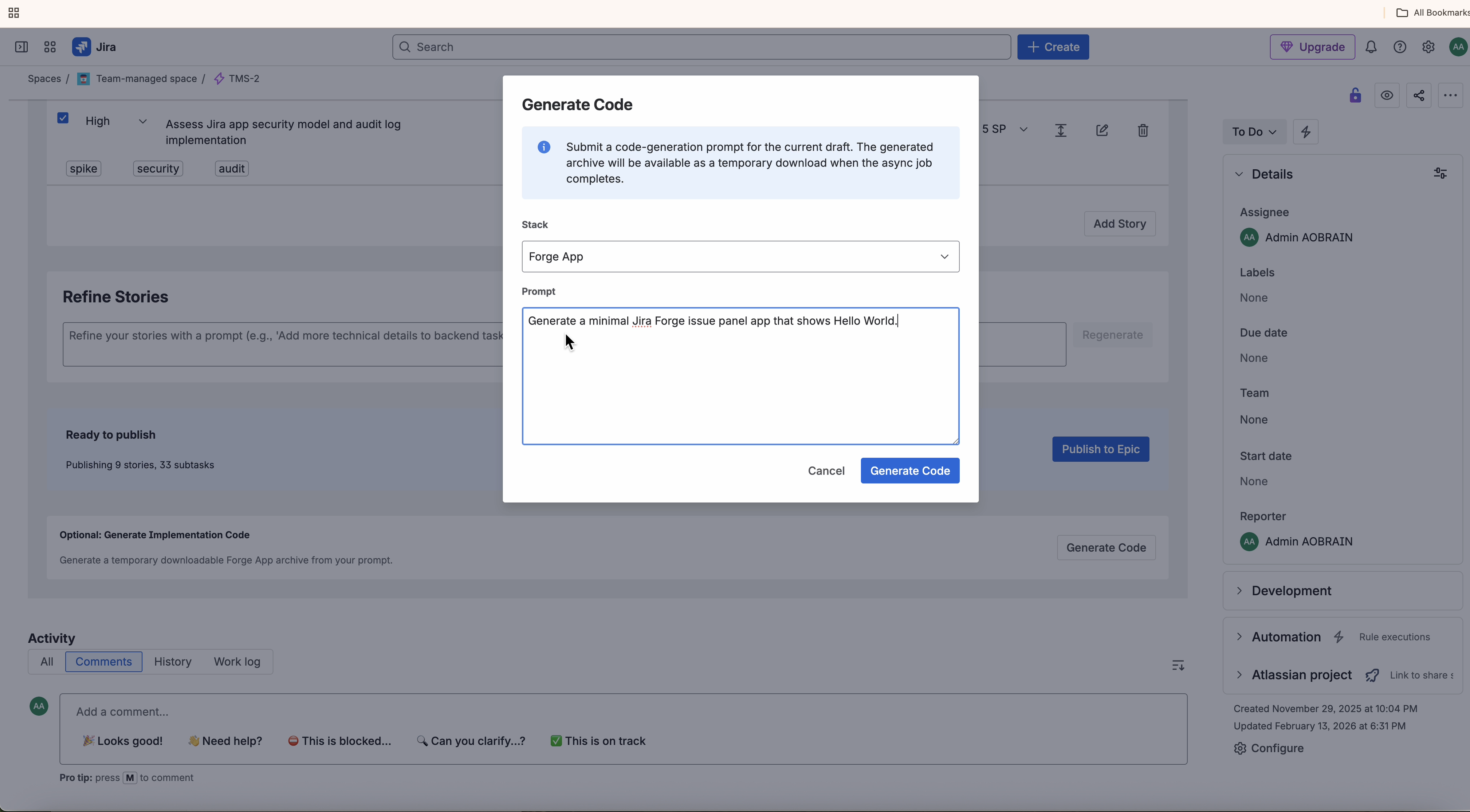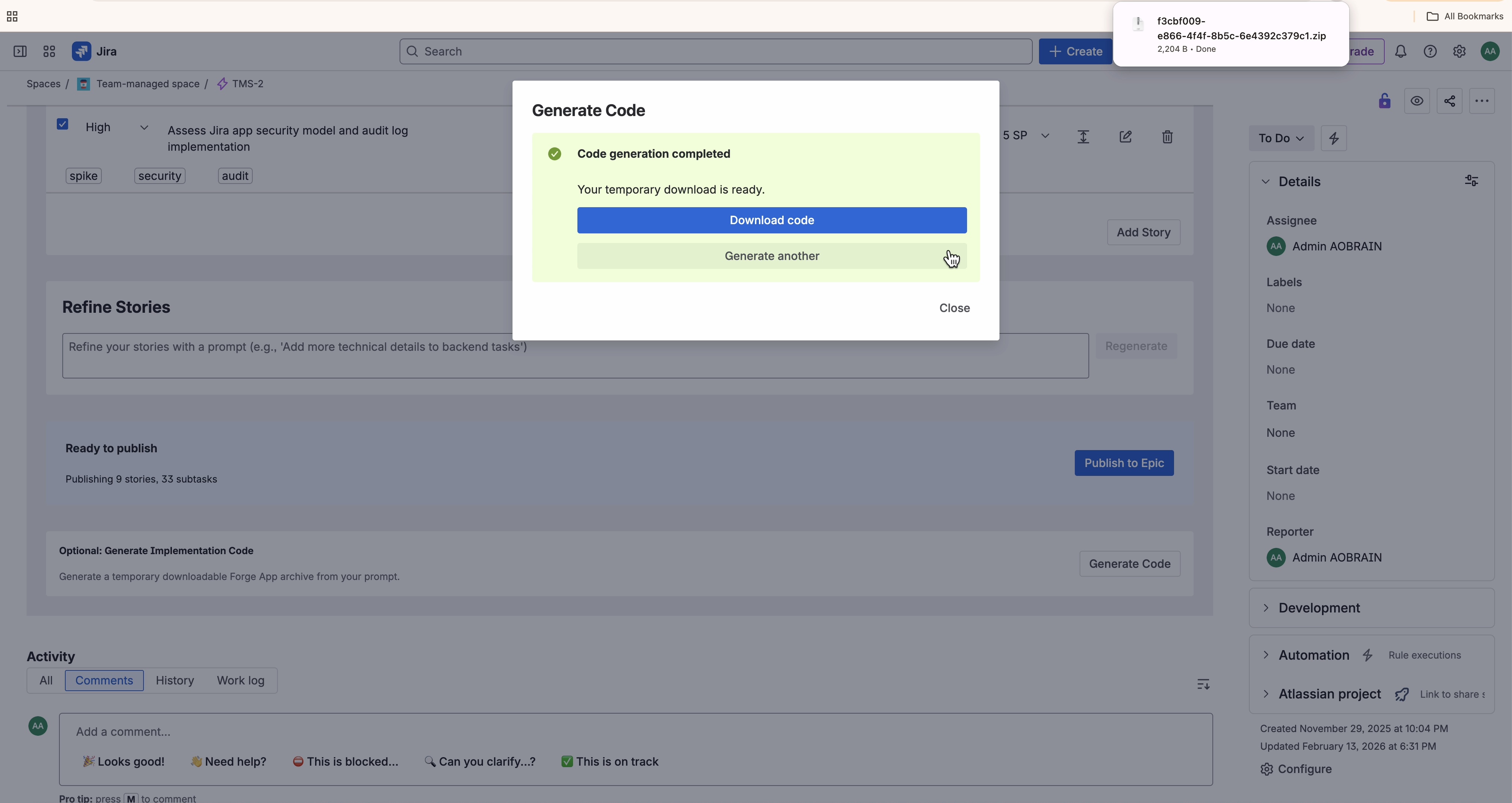 - a working end-to-end generation flow from Jira UI to downloadable artifact