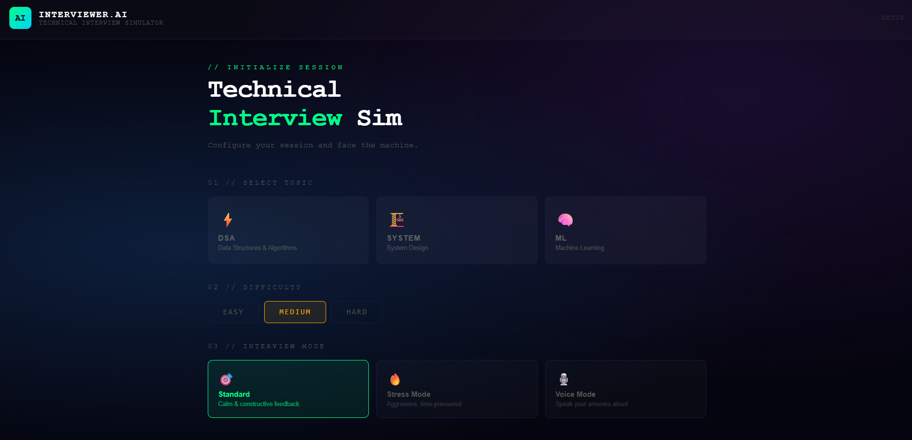As a developer preparing for technical interviews, I noticed a significant gap in available tools. Most platforms provide static question banks with no real feedback mechanism. I wanted to build something that simulates the actual interview experience — an AI that not only asks questions but evaluates your thinking process and tells you exactly where you stand.