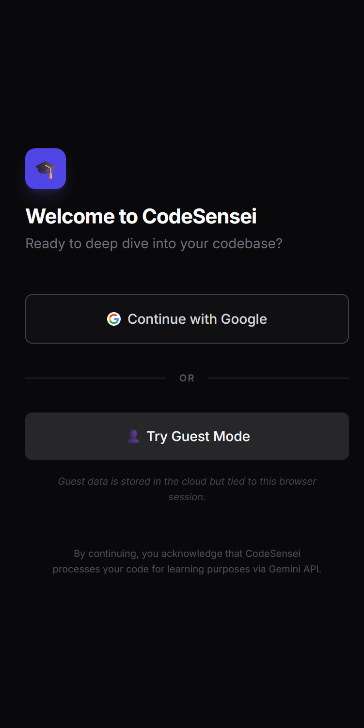$$\text{CodeSensei} = \text{Frontend}_{\text{React}} + \text{Backend}_{\text{Firebase}} + \text{Intelligence}_{\text{Gemini}}$$