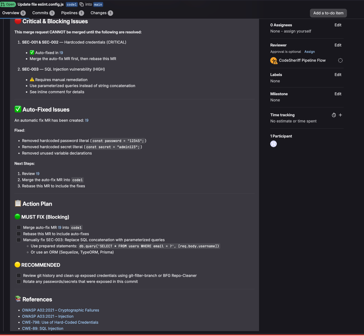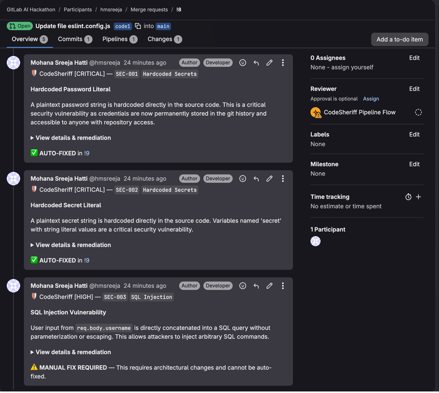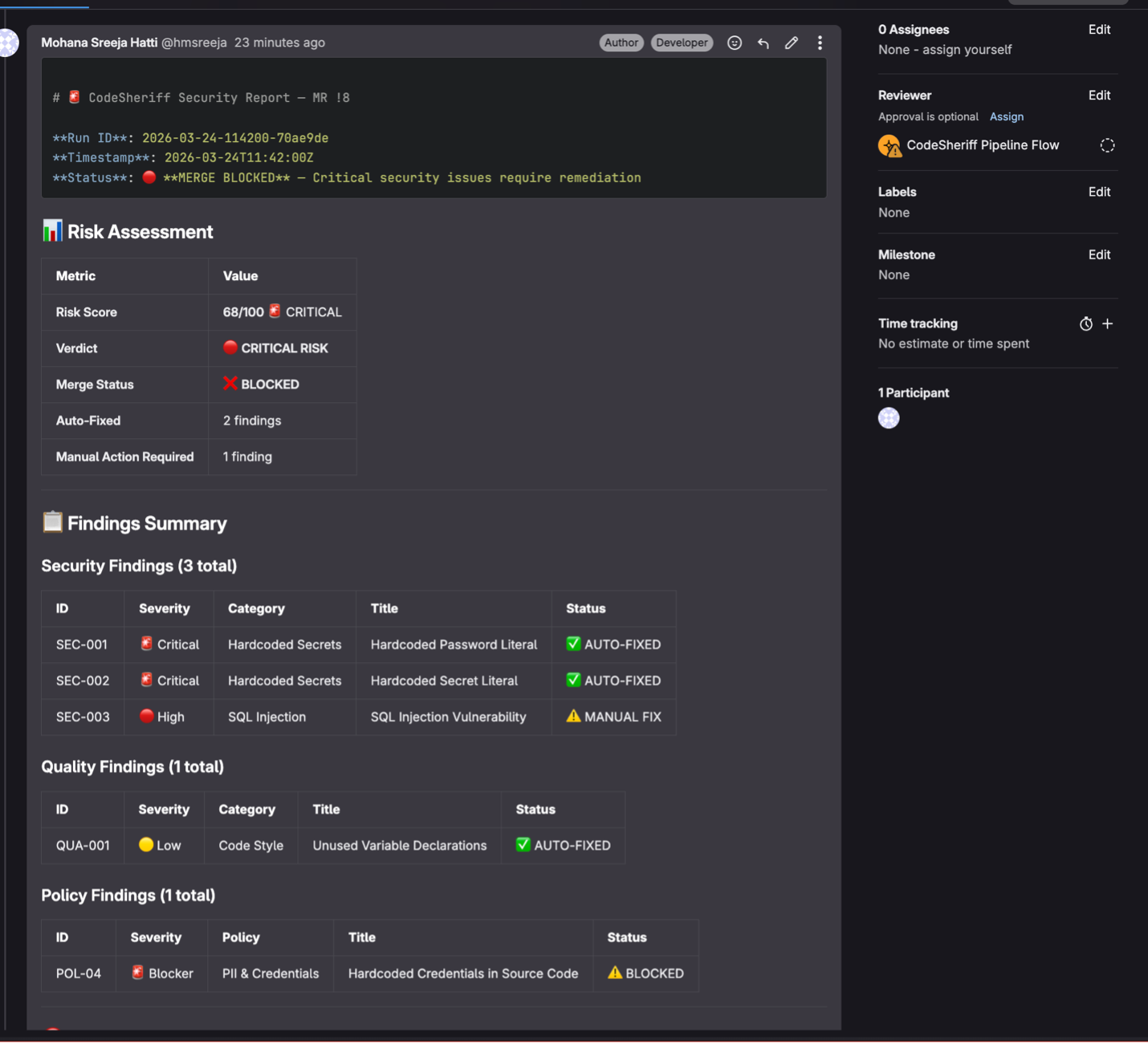 Codesheriff is an AI-powered security agent integrated with GitLab.