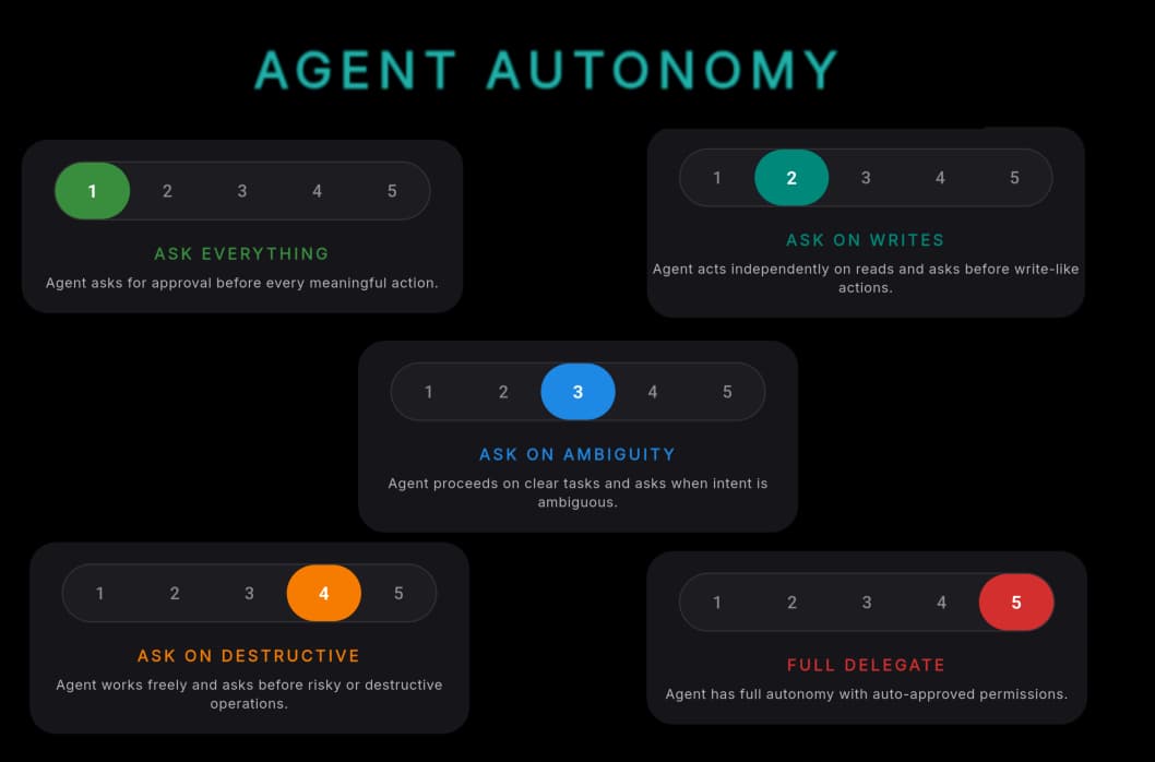 The main idea is a dependence dial you set it from 1 to 5 before you start working. At 1, it asks you before touching anything. At 5, it goes and does the whole thing and reports back when it's done. Everything in between has specific rules: what needs approval, what can just happen, what gets flagged. You control it, it doesn't control you.