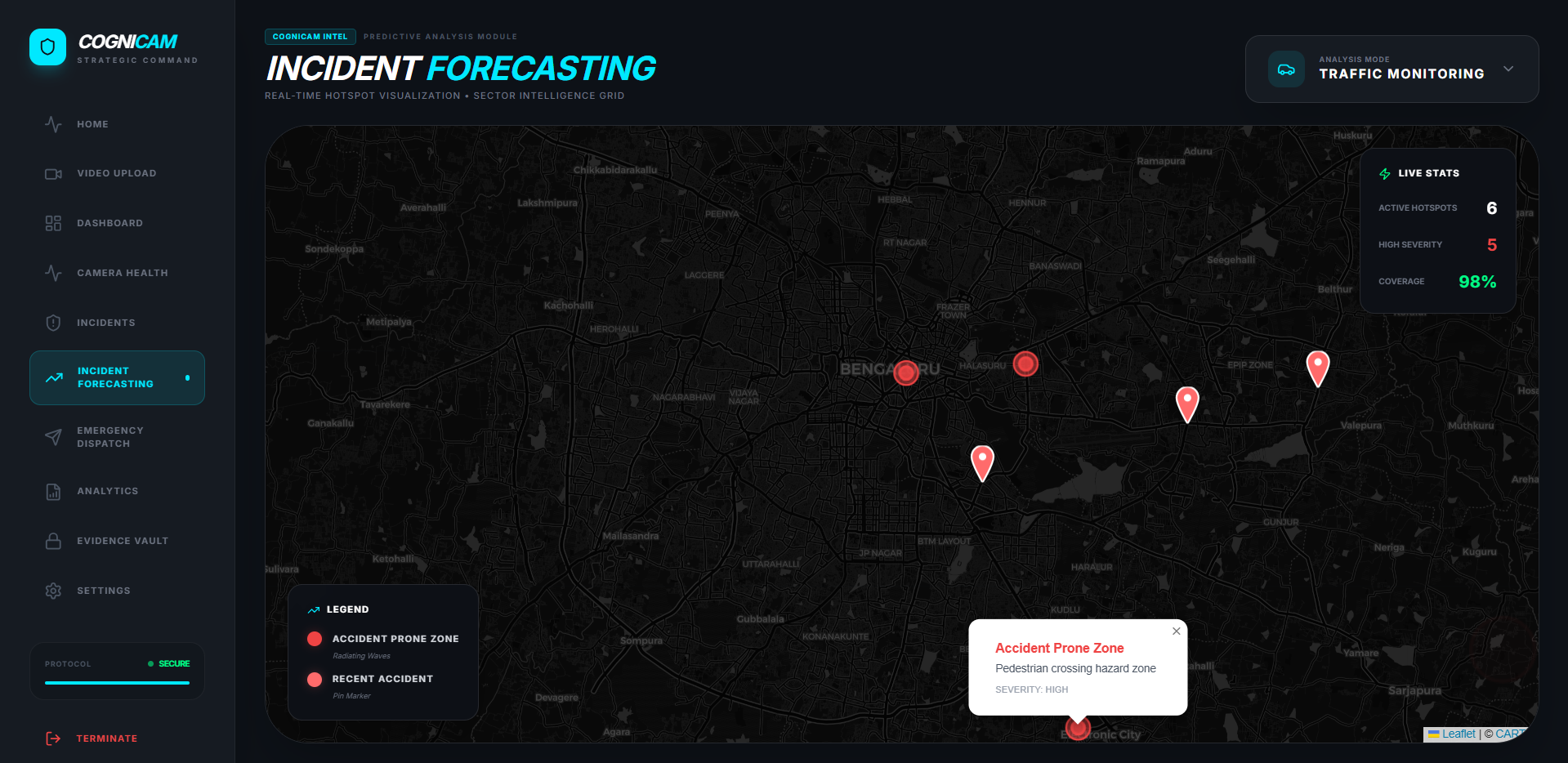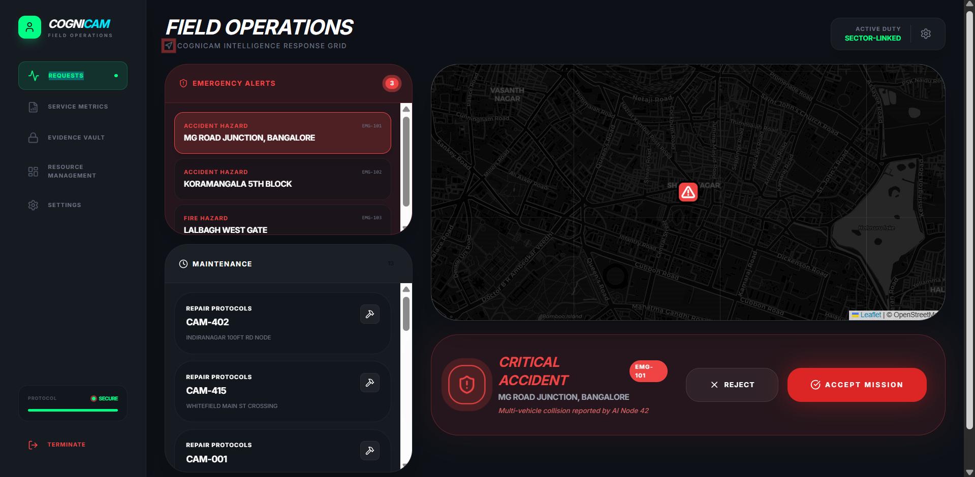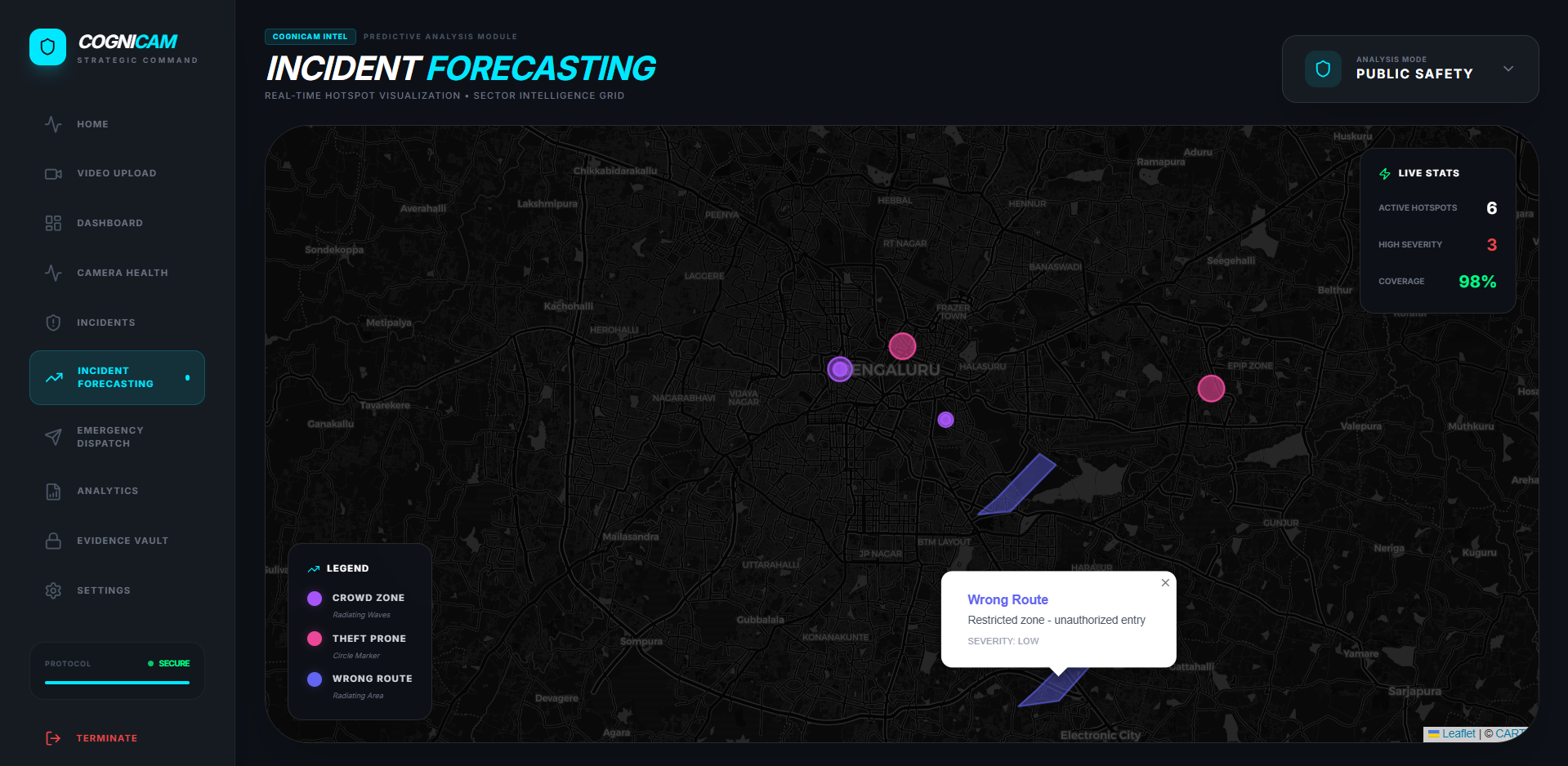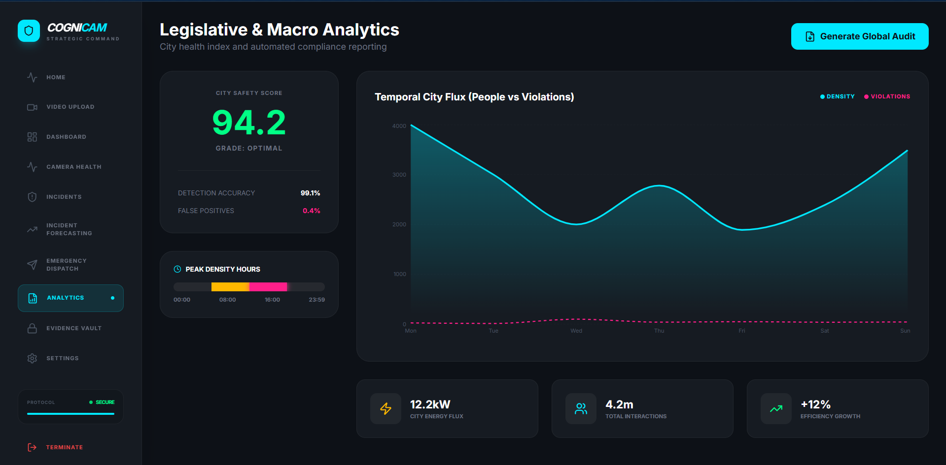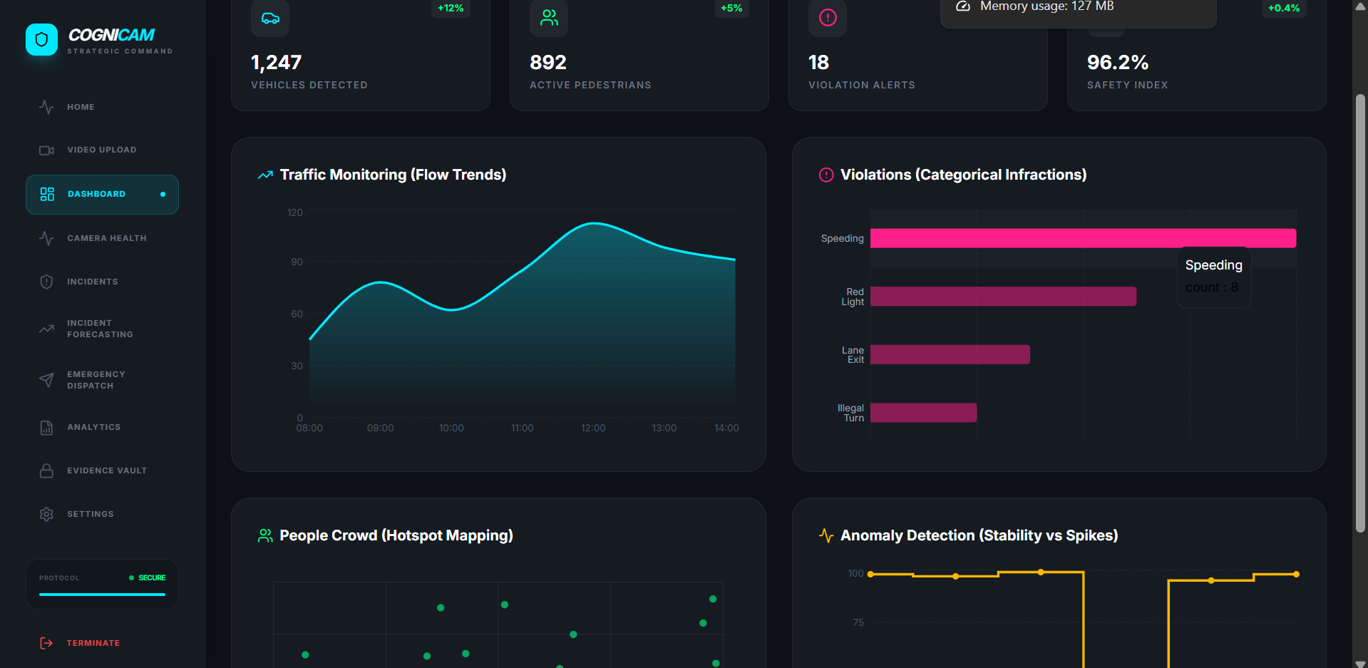 Modern cities generate massive amounts of camera data from CCTV and surveillance systems, yet most of it is underutilized or analyzed too late to prevent incidents. We were inspired to build CogniCam to convert passive video streams into real-time intelligence that improves public safety, traffic control, and urban operations.