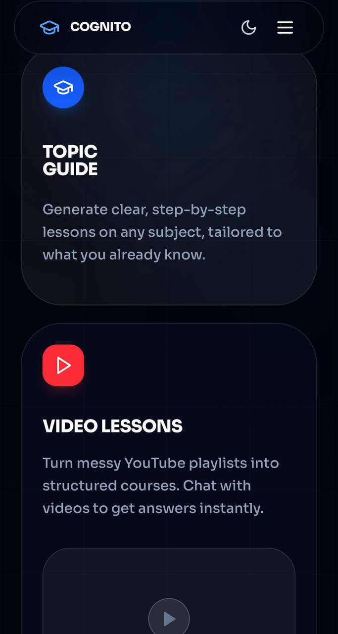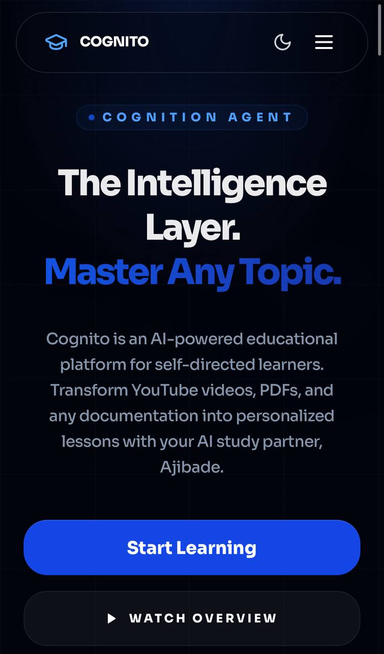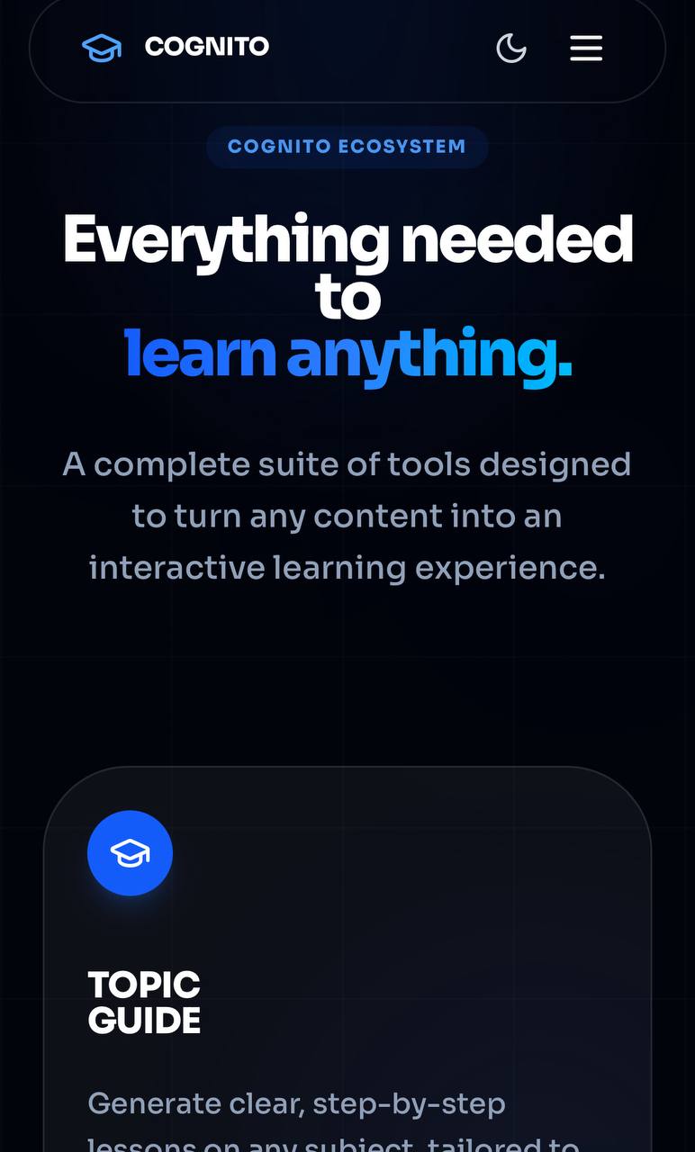 Cognito was born from the idea that learning should adapt to each person’s way of understanding, instead of forcing every learner into one rigid format. It tackles the universal problem many students and self-directed learners face: information overload without personalized structure. By combining AI with learning materials like videos, PDFs, and text . Cognito transforms raw content into smart, tailored lessons that make learning more efficient, engaging, and effective for people of all ages and backgrounds.