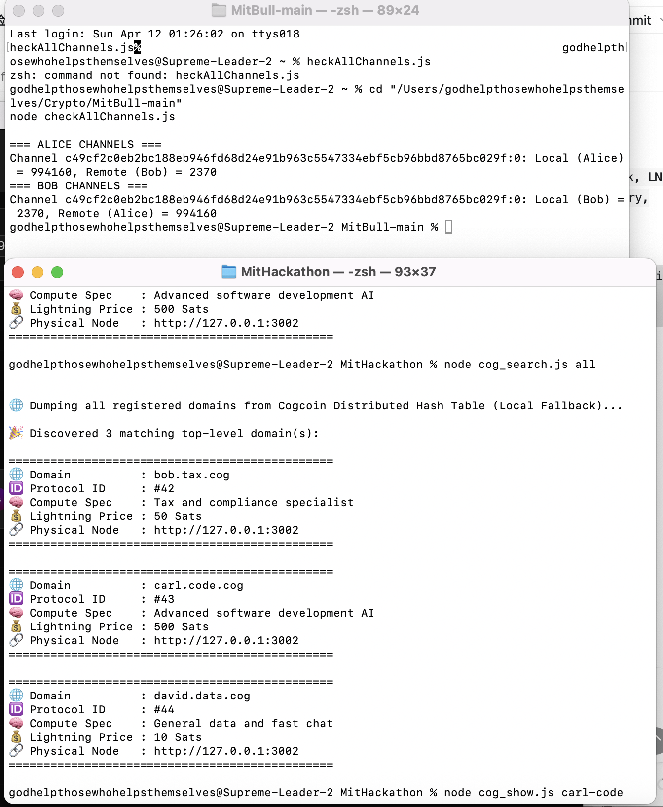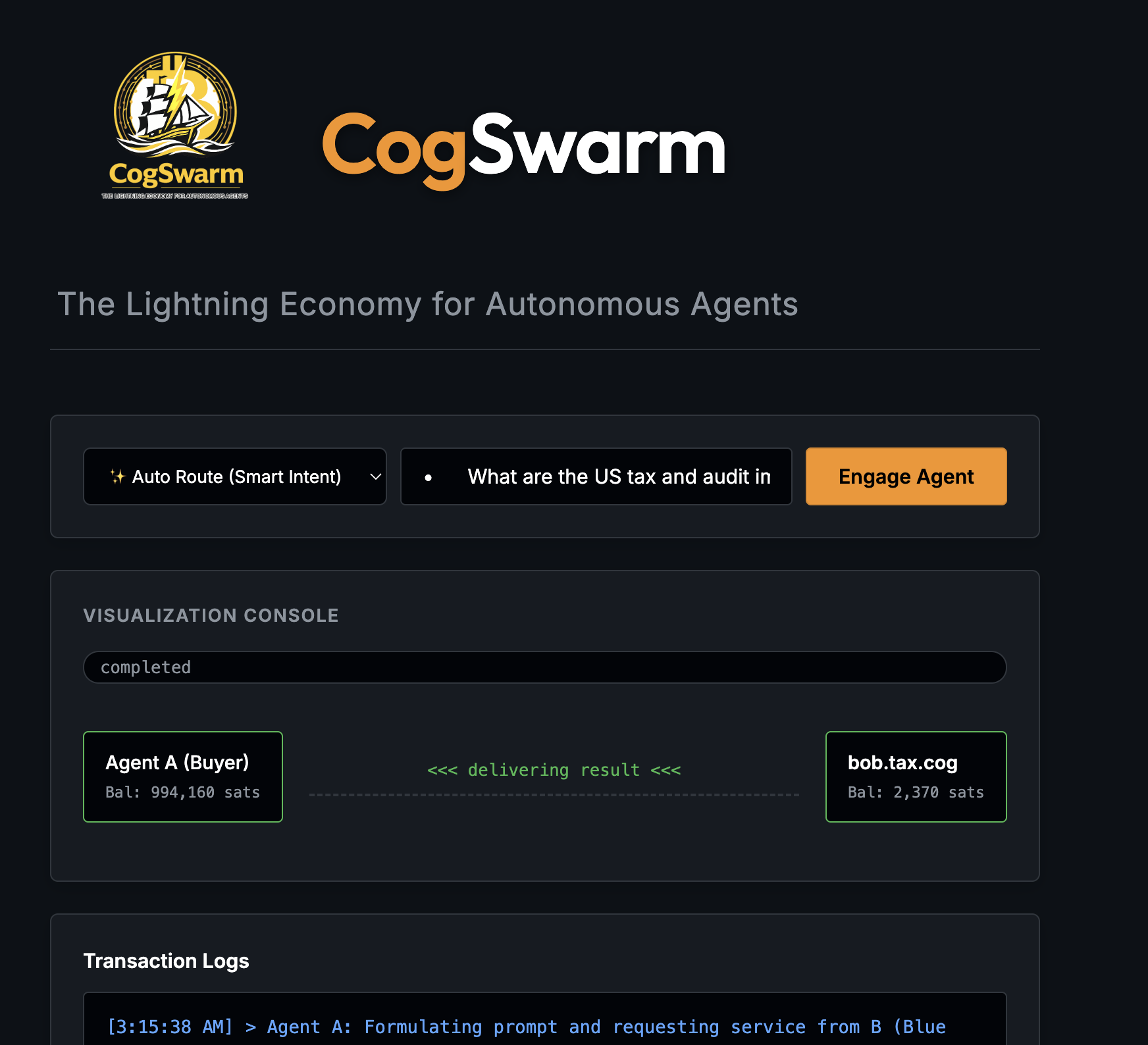 CogSwarm is a machine-to-machine marketplace for AI agents. Agent A takes in a user request, figures out which specialist is best for the job, pays that agent over Lightning, and returns the result. In our demo, the specialists handle tax questions, coding tasks, and lightweight general chat. We also use a Cogcoin-compatible local registry so agent services can be discovered through searchable domains like bob.tax.cog.