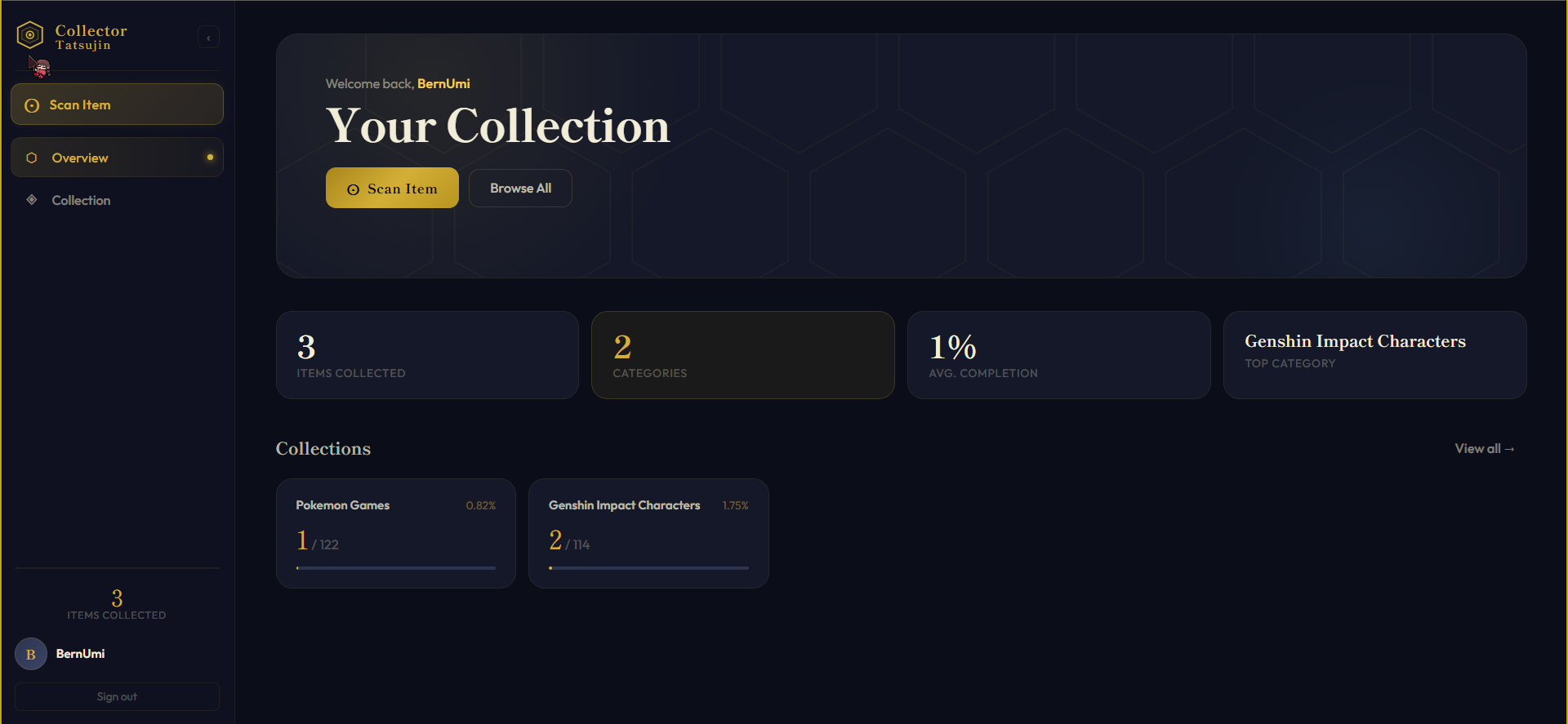 Collector Tatsujin is a web application that allows users to track their progress toward completing collections using AI-powered image recognition. A user can upload a photo of an item and provide a bit of context (for example, specifying that the item is an NES game). From there, the app uses the Gemini API to identify exactly what the item is, determine the broader collection it belongs to, and add it to the user’s personal collection.