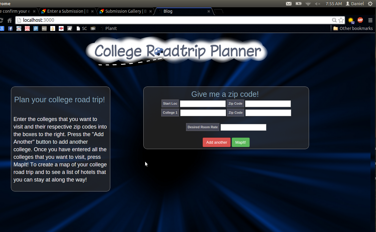 College RoadTrip Planner was made as part of the Priceline challenge. Inspired by our own experiences, we wanted to make a fast easy way to help potential college students research their college road trip. We placed an emphasis on speed, simplicity of use, and breadth of information.