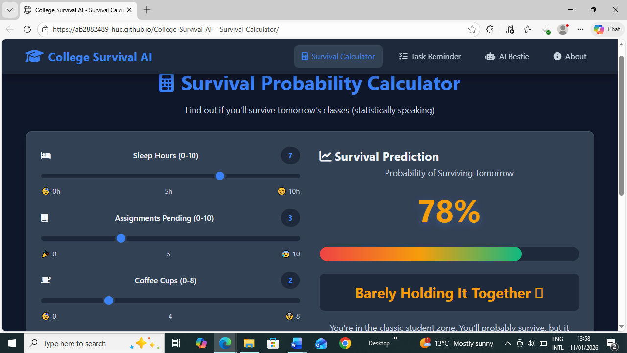 It calculates a student’s “Survival Probability” based on sleep, workload, and habits, tracks assignments and tests with smart reminders, and provides AI-powered academic help through a friendly “AI Bestie” that guides, supports, and motivates students daily.