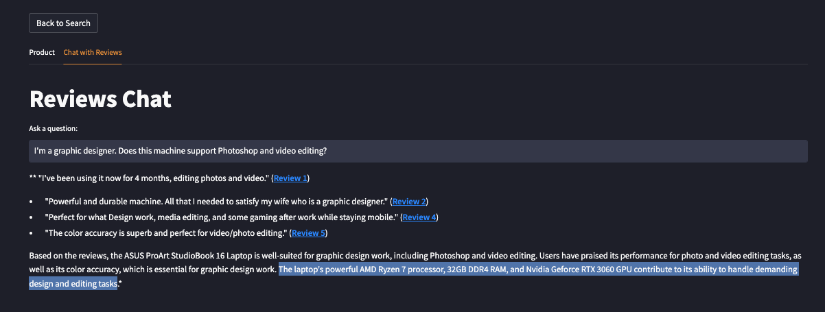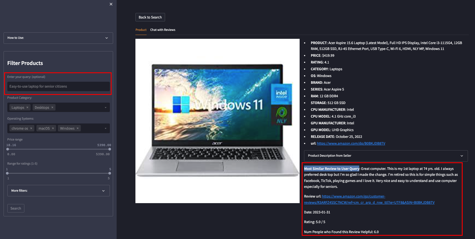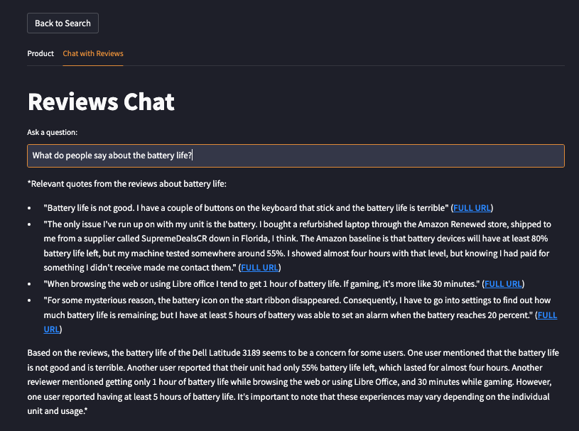 Our platform features a chat interface that leverages the power of quality-controlled retrieval-augmented generation (RAG). By utilizing a custom pinecone.query() + cohere.rerank() + openai.ChatCompletions() chain, users receive detailed responses based on both product specifications and relevant reviews. This feature not only provides valuable insights to potential buyers but also serves as a tool for sellers performing market research.