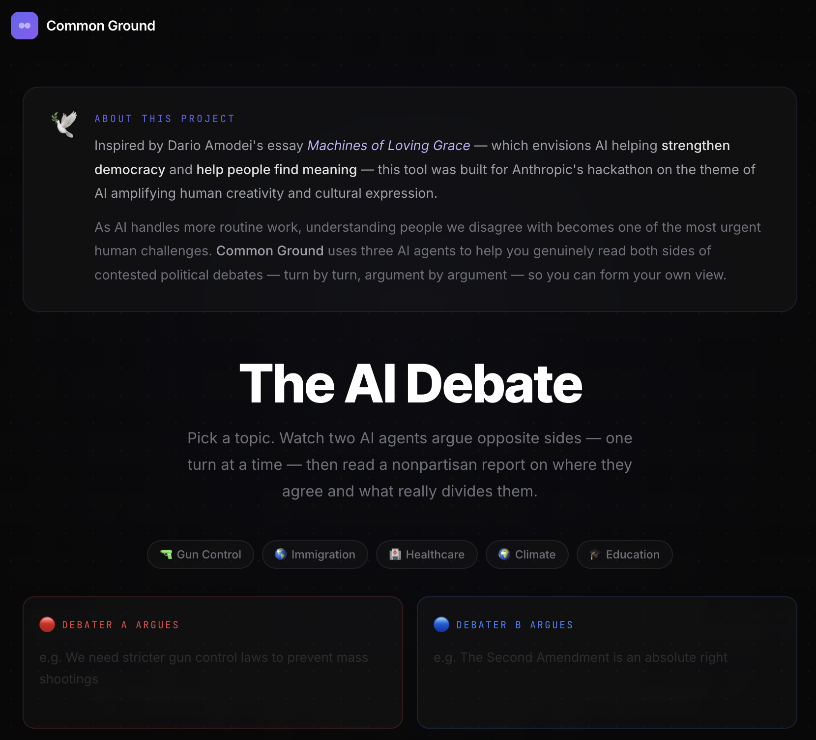 The prompt for this hackathon asked us to build something that amplifies human creativity, helps people find meaning, or supports cultural expression. That framing — combined with Dario Amodei's essay Machines of Loving Grace — pointed me toward a problem that feels increasingly urgent: we have almost no tools that help us genuinely understand people we disagree with politically.