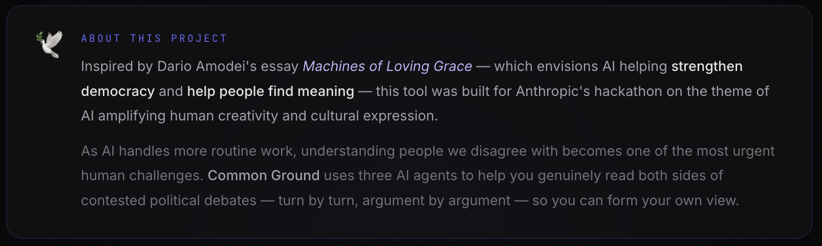 Most political content online is designed to inflame, not illuminate. Algorithms reward outrage. Comment sections are battlegrounds. And yet Amodei's essay envisions a future where AI actively strengthens democracy — not by picking sides, but by helping people reason better together. I wanted to build something that made that concrete and tangible. Not an AI that tells you what to think, but one that slows the conversation down and shows you the human values on both sides.