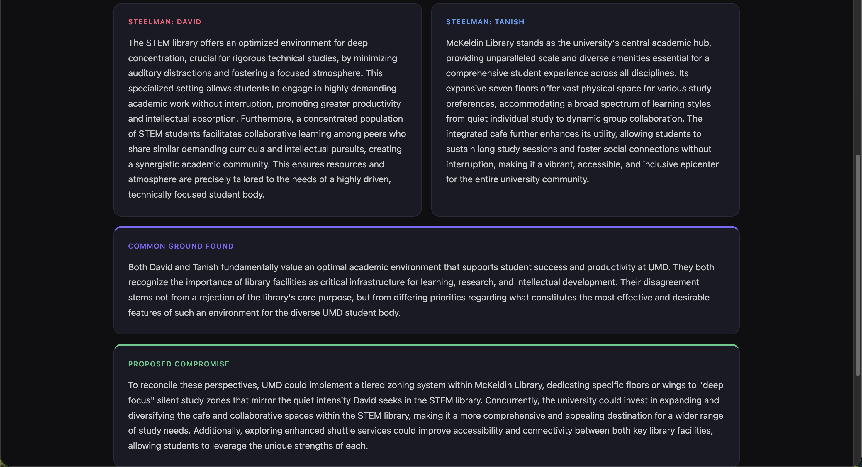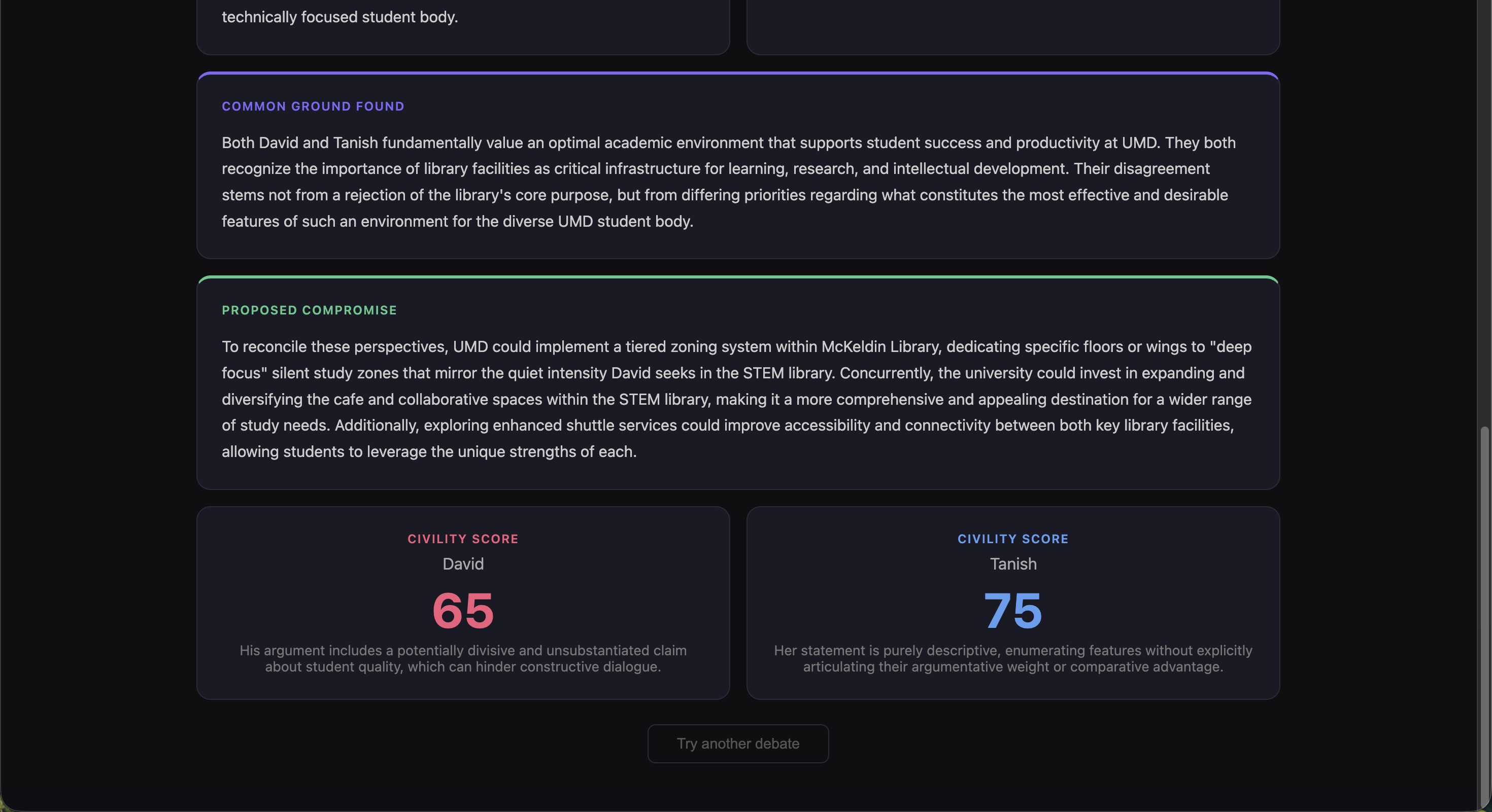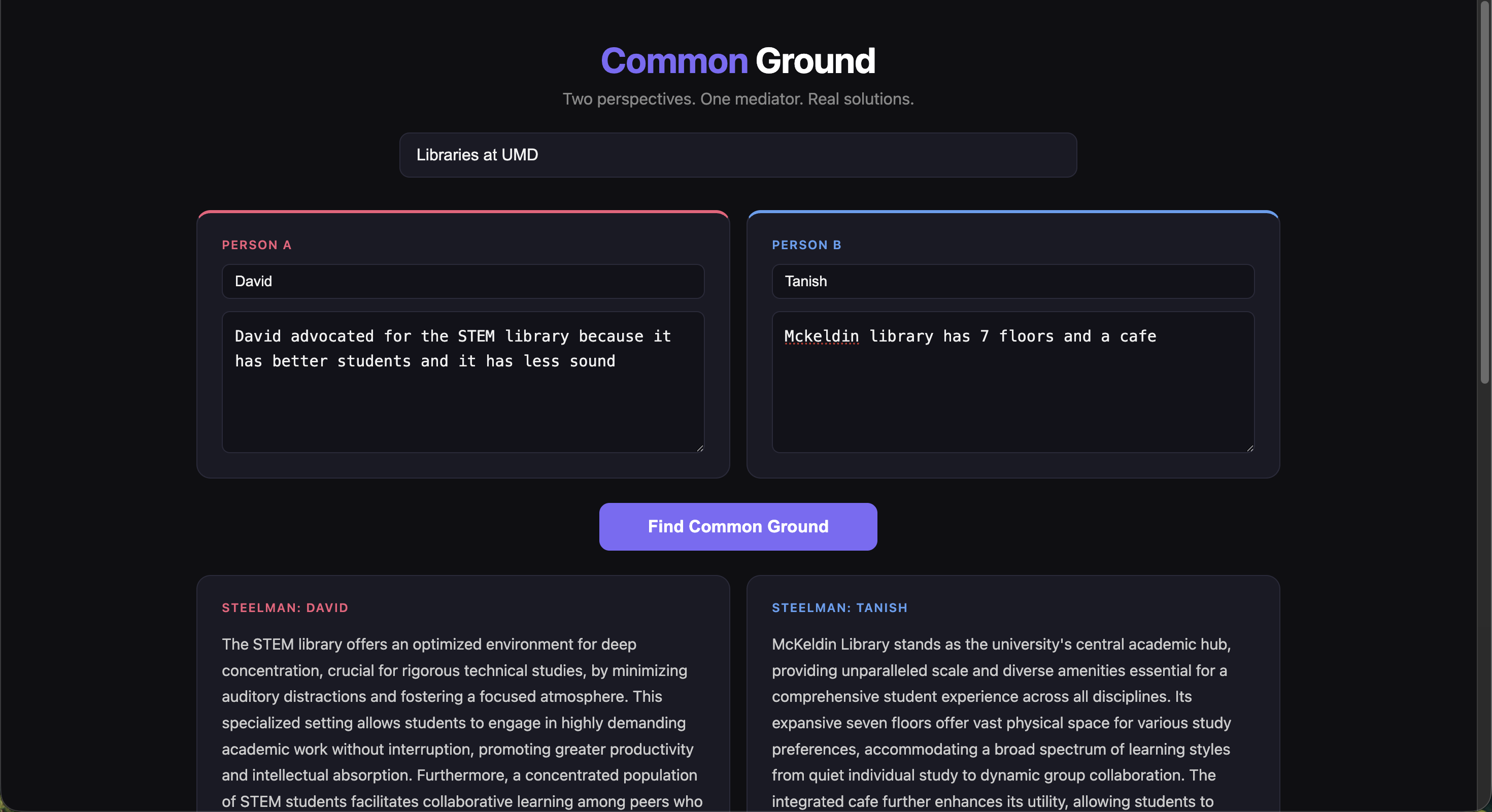 We began by researching the most pressing social issues dividing America today, using tools like Gemini, ChatGPT, and Claude to understand the landscape of polarization. We realized that in heated debates, finding a middle path is incredibly difficult. We were inspired to create a tool that acts as an entirely unbiased mediator, one that isn't swayed by human emotion, possesses a vast knowledge base, and can objectively guide differing viewpoints toward mutual understanding.