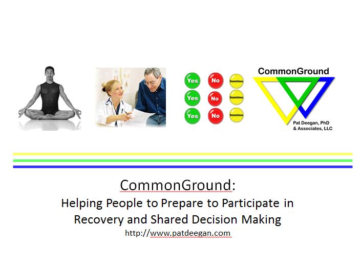 CommonGround is a web based application optimized for mobile iOS devices. It was developed by and for people in recovery from mental health conditions. The app helps us self manage psychiatric conditions, learn about recovery and participate in shared decision making with our psychiatrists. It amplifies our voice (little data) and brings it to the center of the care team.