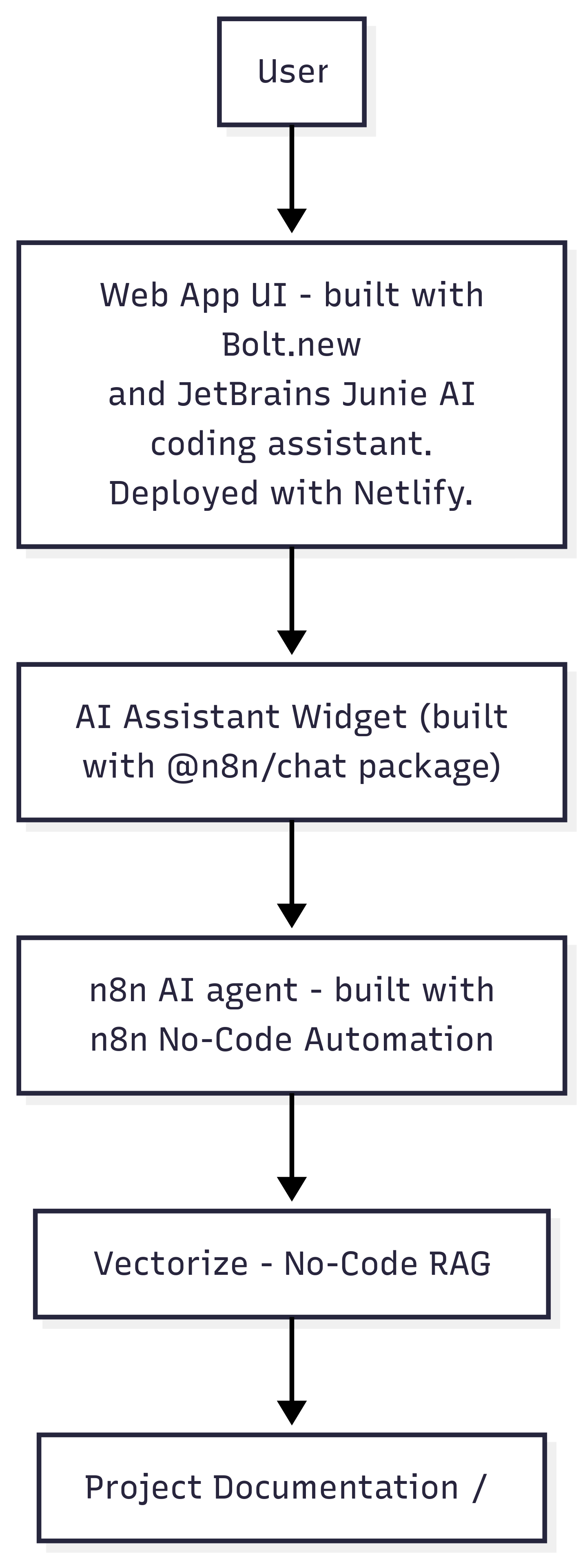 While developing, It was pretty challenging to decide which features to prototype with bolt.new platform, and which features to develop with a coding agent. Adding n8n AI Agent with rag_context tool based on project documentation and implemented with https://platform.vectorize.io platform was pretty challenging.
